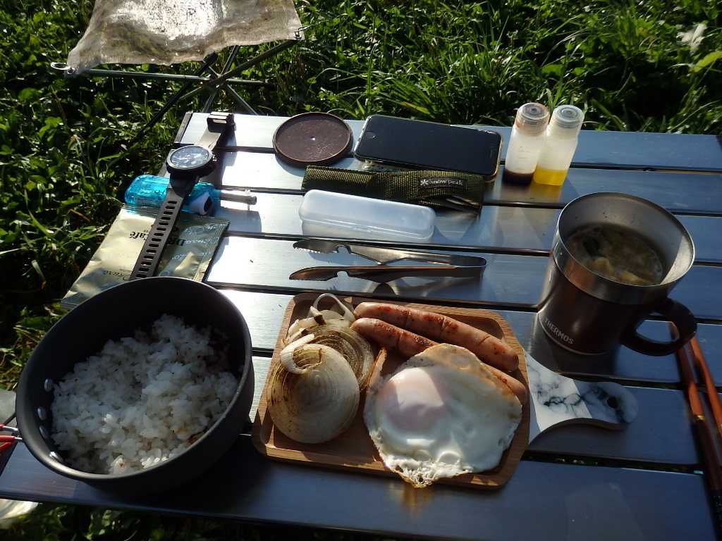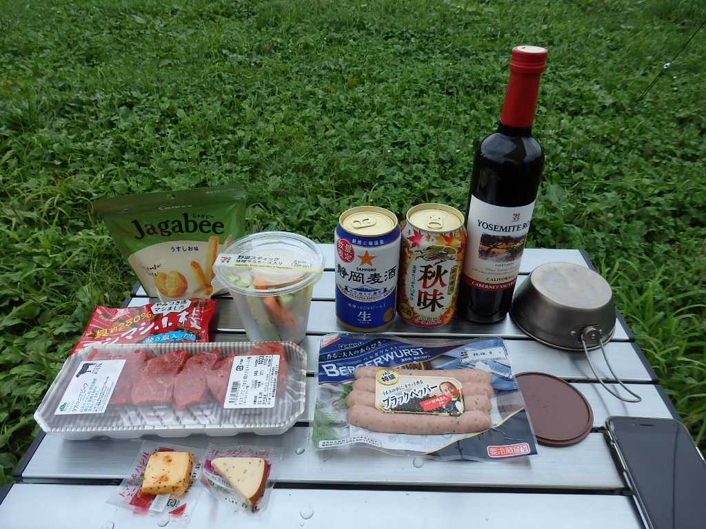 コーヒーで一息ついて温泉と飲み物の調達へ。バナジウムの天然水を使用しているという風の湯で汗を流してすっきり。コンビニで夜のお供(ワイン、ビール、つまみ)を仕入れてキャンプ場へ。