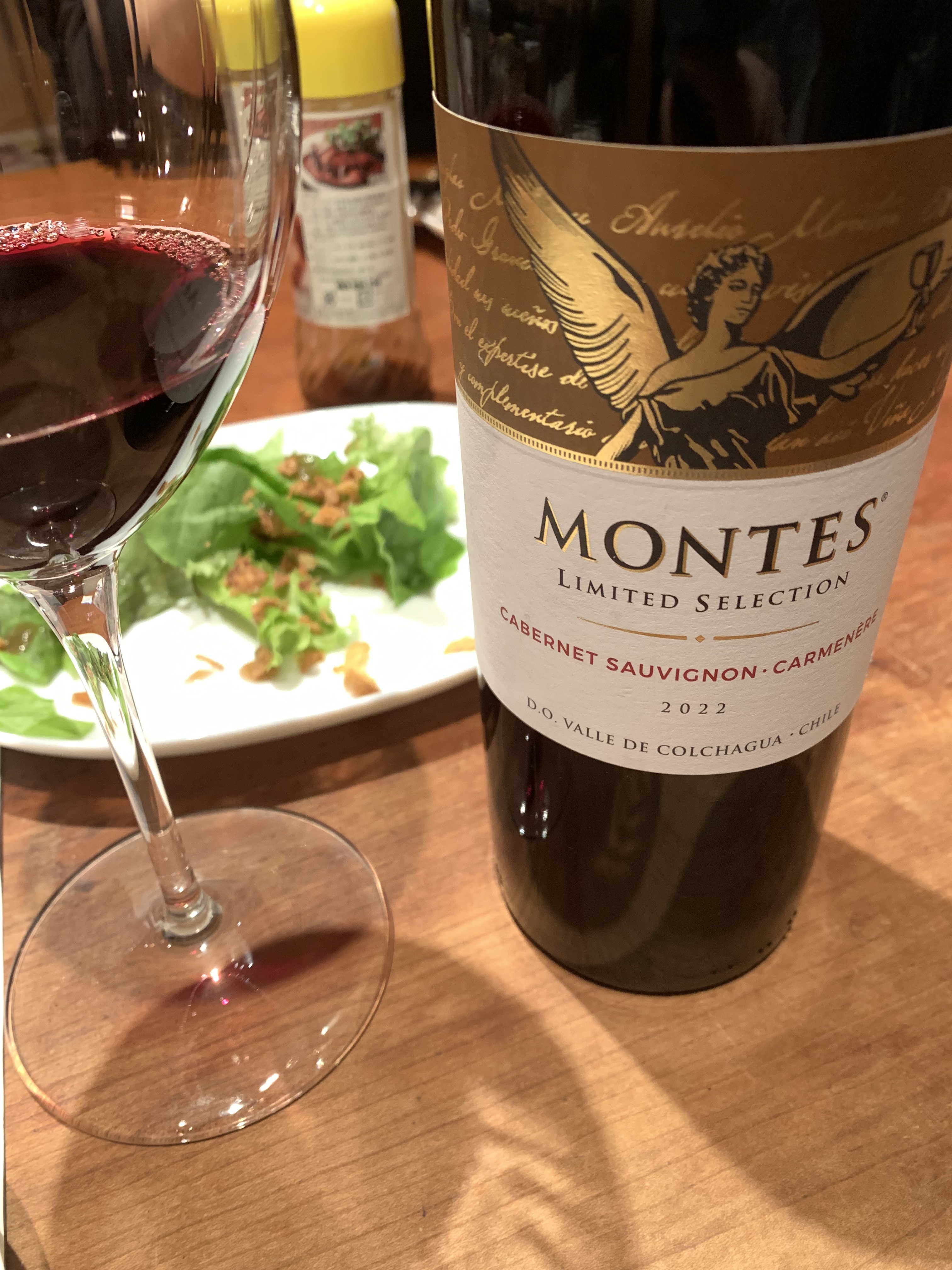 チリのモンテス。コロチャグア バレーのワイナリー。エノテカの輸入。モンテスのグランド・リザーブはカルディーで1980円で打っていたが円安の影響で2500円ぐらいする。グランド・リザーブはそこそこ濃いし飲みごたえがあるが、このリミテッド・セレクションは1800円ほど。やっぱり、ワインは価格に比例するんだよなー