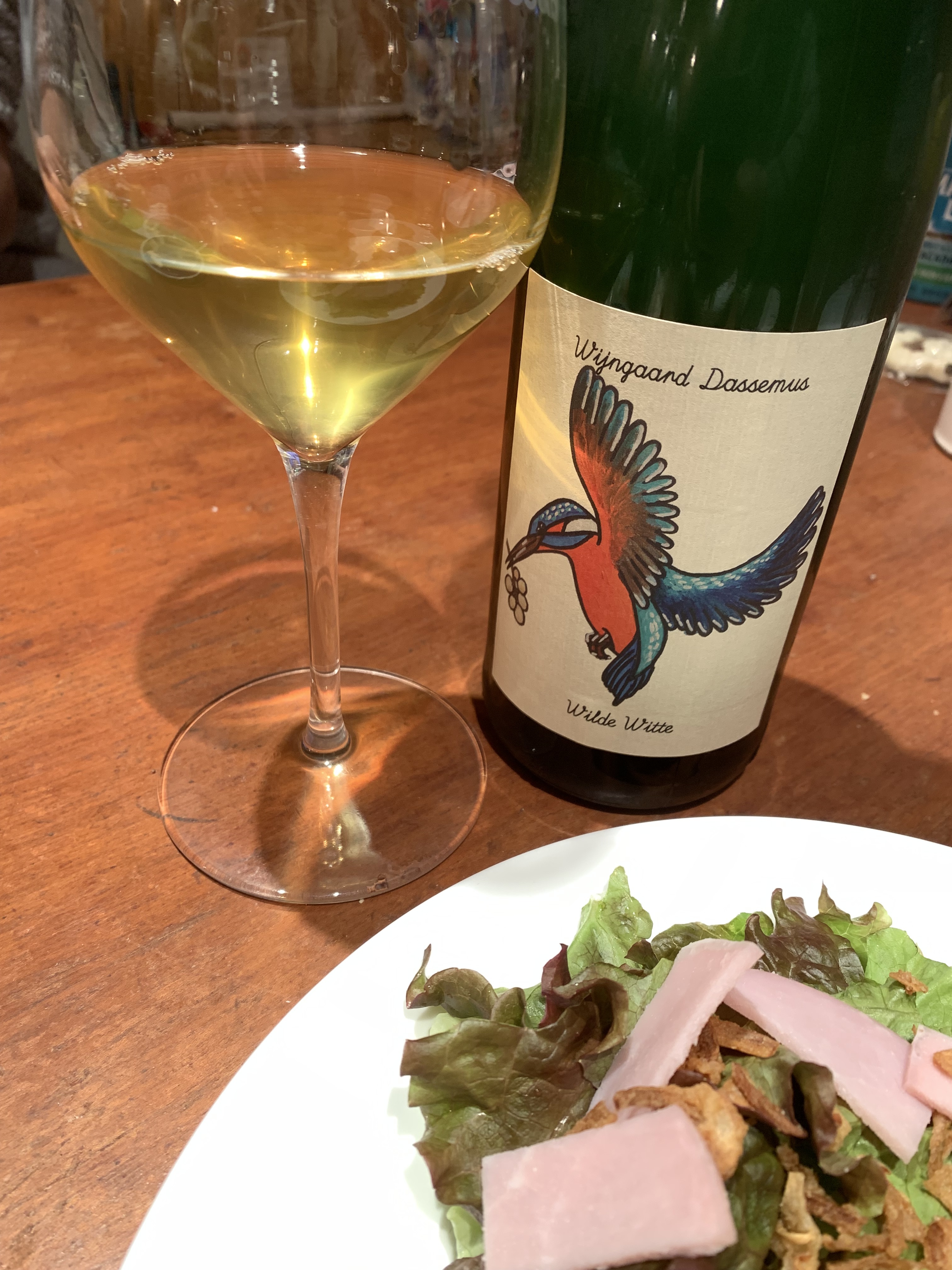 私の最も信頼する後輩がハウステンボスで買ってきてくれたオーガニックの天然酵母ワイン。Wijngaard dassemus 読めない。ワインヤード ダッセムス みたいな感じだと思う。ダッセムスというシャトーみたいな。ソラリス種とヨハニーター種 ヨハニーターはドイツの品種だという。オランダのワインは初めて飲む。色は白としては濃い目。少し濁り。アタックはかなり強い酸味があり、発泡の炭酸のようなシュワ感がある。無濾過という事でやや酵母の香りもあり、白ワインというよりはスパークリング・ワイン的な感覚で、濃さも強い味の部に入るような感じ。今までに無い印象。チーズに合う。オランダの主食ってよくわからないが、もっぱらジャガイモ、それもフライドポテトと、パン、ハム、チーズ、それが朝食と昼食。夜は野菜とじゃがいも、肉類の煮物、、、らしい。そういう意味ではこのワインはハムやチーズ、酵母パンにはかなり相性が良さそう。