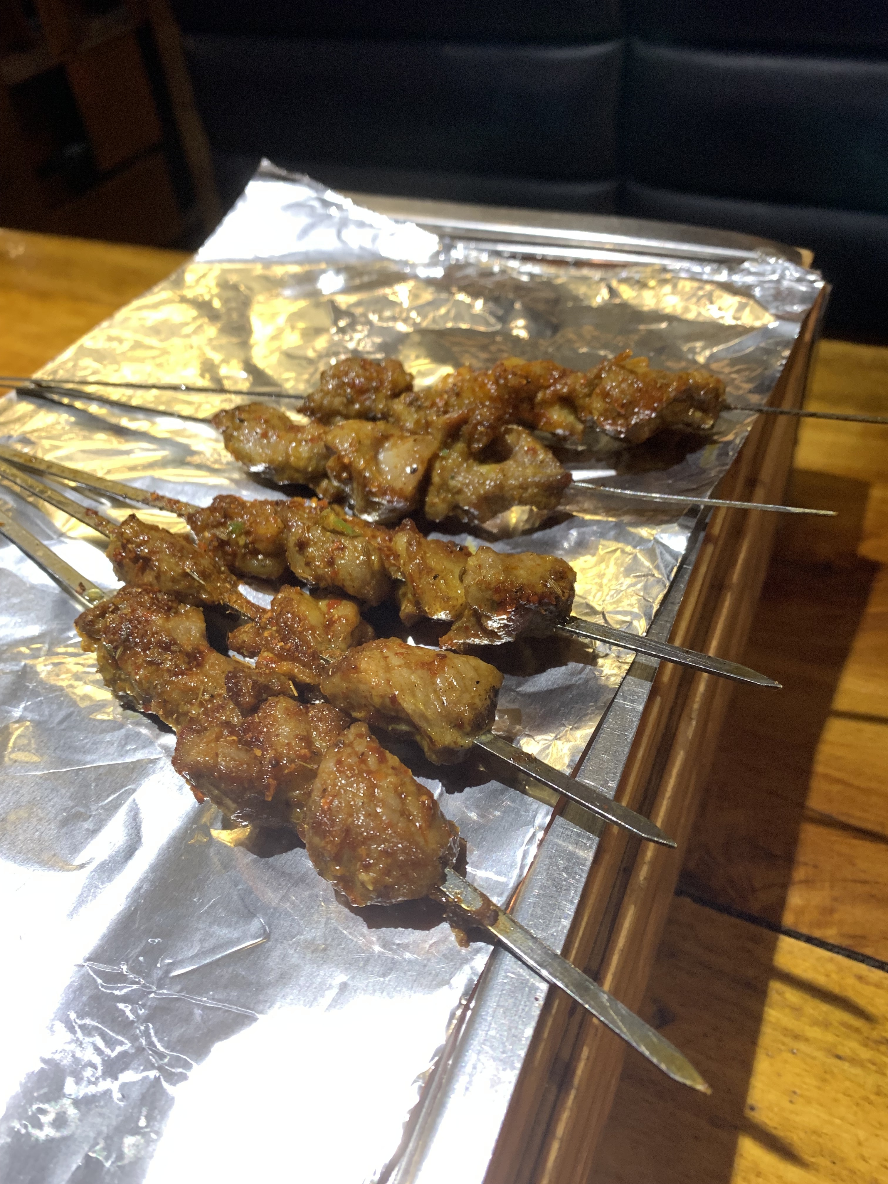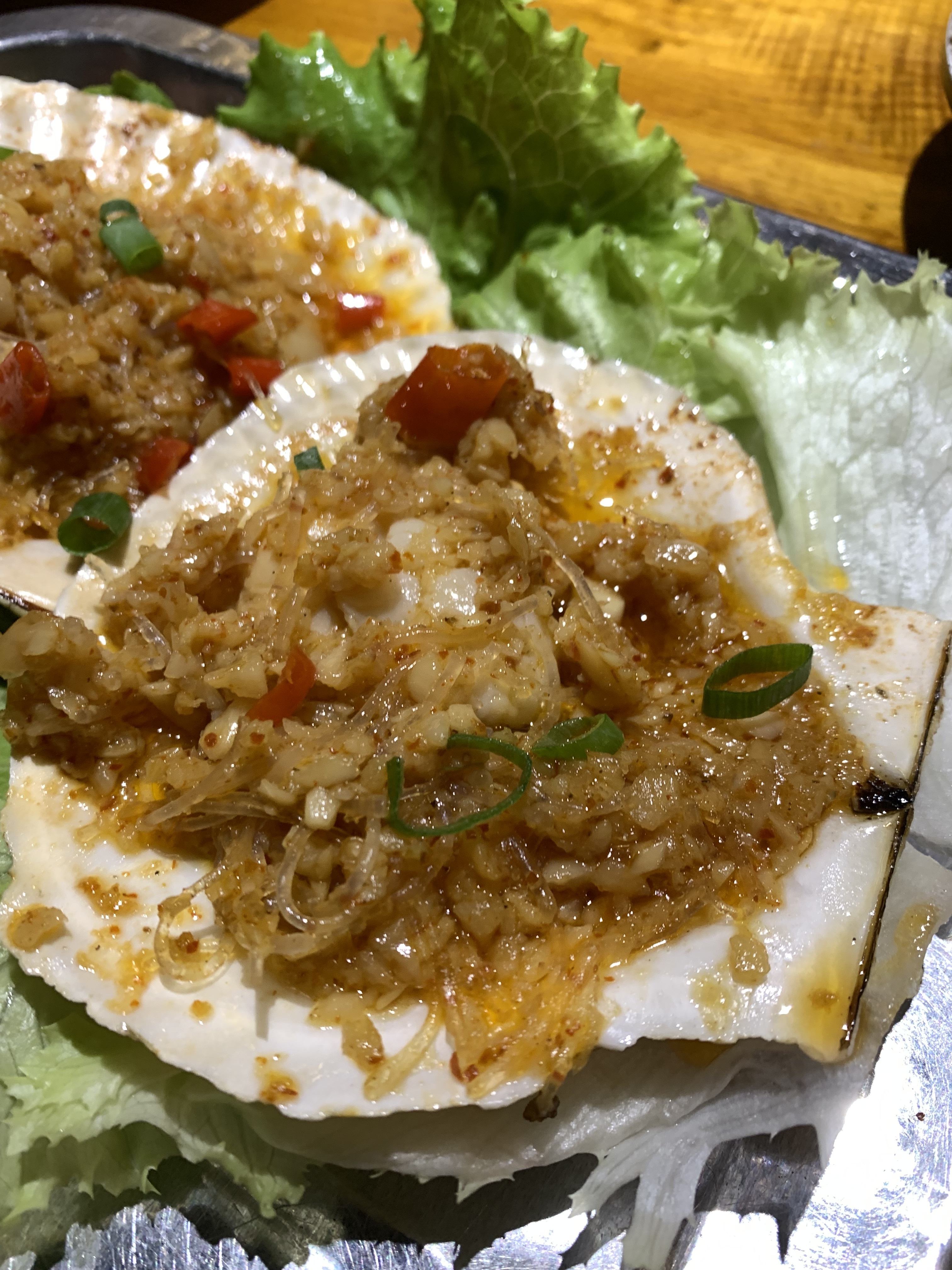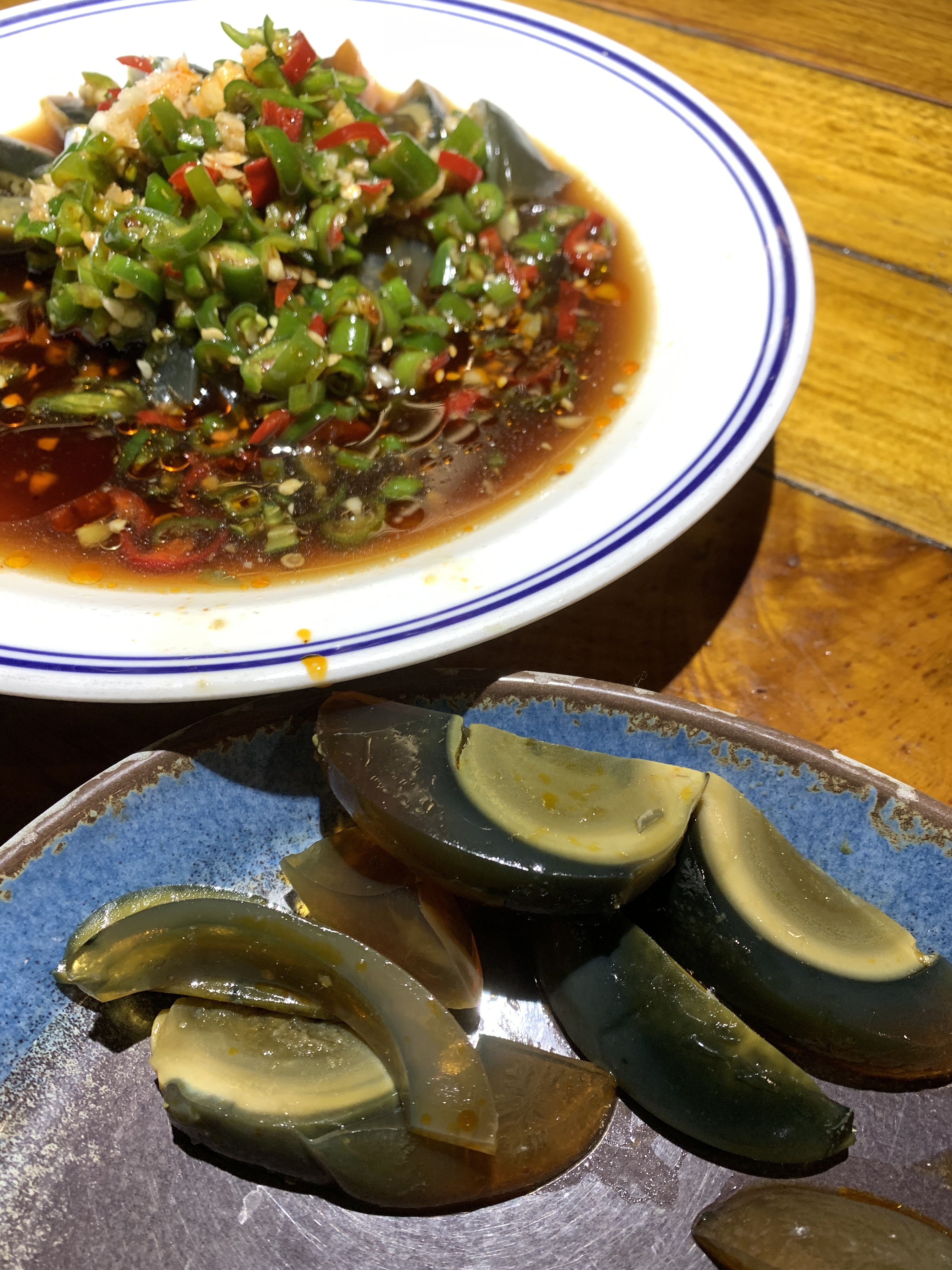 西安定番の羊串焼と、ホタテ貝の上に小エビとかなんかいろんな旨み具材が載せて焼いたつまみ。そんで美味いけど辛すぎるので汁から取り出して食べてるピータン。