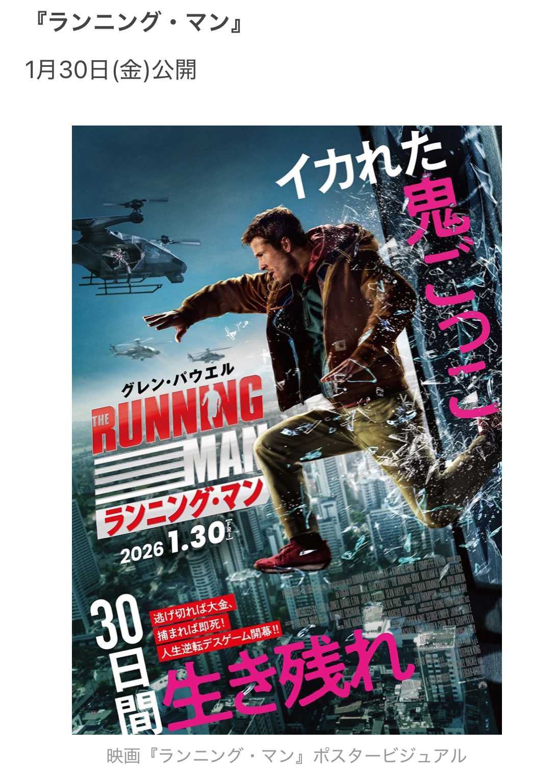 ランニング・マン、はスティーブン・キングの古い小説で、アーノルド・シュワルツネッガー主演で1987年に(バトル・ランナー)として映画化された。したがって映画化2回目となる。1度目は見たような気もする。2025年11月にアメリカで公開され、日本では1月30日公開されたSFアクション。予告編からはB級映画の匂いが強くしていたが、結構な大作でありB級とはいえない。しかしお金がかかった大作ではあるが、秀作では無い。腑に落ちない点は多々あるもののSFとしてならばまあまあか。上級市民という人々の街が現代の街なのに対して、主人公は下級市民なんだけど下級のスラム街みたいな方がブレードランナー的な未来の街感が凄い。アンバランスにちょっとワロタ。あと腑に落ちない点は5箇所以上あるかも。ただし、ストーリーは何とか維持されている。というか、場面の転換が激しく、ついていくのが大変。86点もともとリチャードは近未来の何処に住んでいたのか?ワシントンとかフィラデルフィアかもしれない。というのは先ず列車でニューヨークに行ってホテルに宿泊する。そしてボストンへ行く。退役軍人の安宿はすぐに見つかってしまって、次にメイン州に行き田舎の家で匿ってもらい、カナダの国境を目指す。。、、、、、、、逃げ切れば大金を手にできるが、捕まれば即死という命懸けの鬼ごっこに挑む男の運命を描くノンストップアクション。ベストセラー作家スティーブン・キングがリチャード・バックマン名義で1982年に発表し、1987年には「バトルランナー」として映画化された小説を、「ベイビー・ドライバー」のエドガー・ライト監督が新たに映画化した。ベン・リチャーズ役を「トップガン マーヴェリック」「ツイスターズ」のグレン・パウエルが演じ、彼をゲームへと誘う冷酷なテレビプロデューサーをジョシュ・ブローリン、ショーの司会者をコールマン・ドミンゴが演じる。