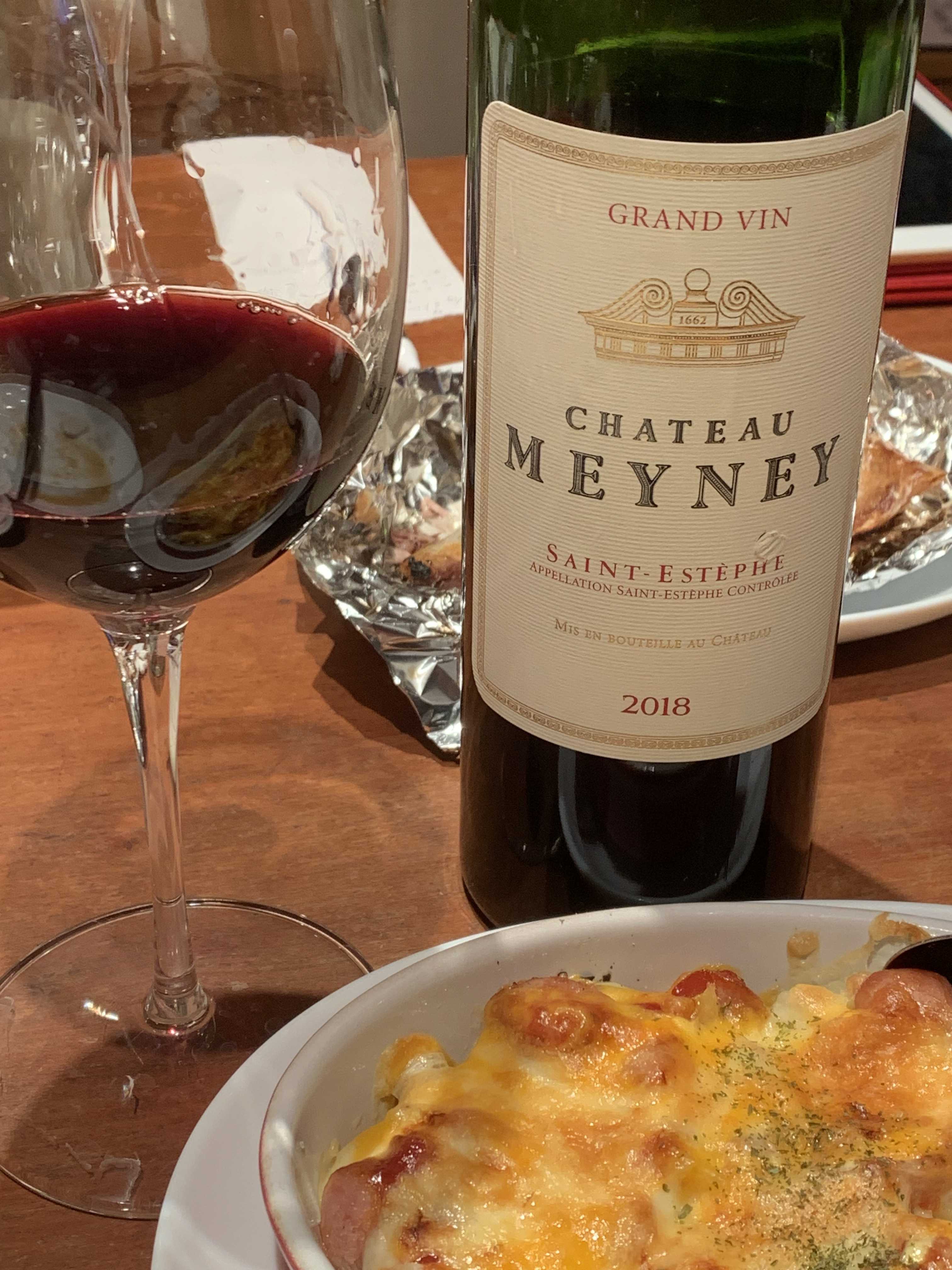 シャトー・メイネイ(Château Meyney)は、フランス・ボルドー地方メドック地区サン・テステフ村名AOCワイン。最も古いシャトーの一つで1660年の設立だという。とても有名なシャトーで、グラン・クリュ・クラッセ格付シャトーに匹敵する品質と評され、クリュ・ブルジョワ・エクセプショネルに選出されているが、ラベルにはクリュ・ブルジョワの表示はしていない。黒に近い赤。味わいとしては香りはまあまあで植物油やイチゴのアロマ。タニックで強い酸、甘みは全くなく、凝縮した果実味、茎や青汁系の骨格のある味わい。ボディーはミディアム。油の多い肉だとマリアージュ的には少し負ける印象。ボルドーメドックの特徴を完全に表現しているワインだけども、超一級の深淵さは少し足りない。しかしコスパは素晴らしい。流通価格 6000〜7500ぐらい 750mlで