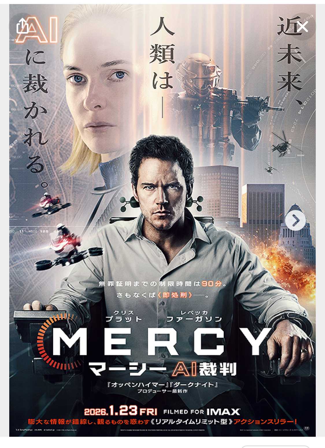 この映画は多分それほど面白くないだろうというアラームが頭の中で鳴りっぱなし!だったのだが、ねこまんまねこ氏はSF映画が大好きなのでB級でも見なければならないと決断!奮起して行ってみた。結論から言うと全く見なくて良いだろう・・・78点。そもそもこの映画は、トム・クルーズのマイノリティーリポート(2002年)という、犯罪を犯す人を事前に捕まえると言う未来の世界を描いた映画に酷似している。この中で警官のトムが妻を殺す罪で事前に捕まる。妻を殺す前に捕まるか、実際に妻が殺された後に捕まるかの違いはあるが、連想させる時点でパクリ映画であろう。この時は事前に判定するのはシャーマンだったというオチだけど、それがAIになっただけ。また、それ以外にも、どこかの映画で見たなというプロットが盗み放題になっている気がする。近未来のロスアンゼルスが舞台だが、近未来感はドローンに警官が1人乗って空を飛べる乗り物だけ。あとは殺人事件の裁判をAIが仕切っているというだけ。この映画の予算はクリス・プラットとレベッカ・ファーガソンの出演料でほぼ6割消えたのではないか?ツッコミどころが満載である。殺人の証拠も映像もないのに何故被疑者が殺人犯である確率が97.5パーセントもあるのか? 最後の方、殺人事件の被疑者であるはずのレイブン(クリス・プラット)が警察隊のスワットとかパトカー車列に激烈に指示を出して完全に捜査リーダーになっていた。単なる1捜査官がなんで?警察のトップは別に居るでしょう?!まあ、、76.77.78点か。ものすごく暇な人は時間潰しにはなるだろう。。。マーシー MARCY というのは裁判所の名前。AI裁判というのは邦題の副題をわかりやすく付けたのだろう。マーシー裁判所でAIが司法を担うことになった近未来。敏腕刑事のレイヴンは妻殺しの容疑で<マーシー裁判所>に拘束された。 冤罪を主張する彼だったが、覚えているのは事件前の断片的な記憶のみ。 自らの無実を証明するには、AIが支配する世界中のデーターベースから証拠を集め、AI裁判官が算出する”有罪率”を規定値まで下げなくてはならなくなった。というアクションスリラー。敏腕刑事レイヴンを=クリス・プラットAI裁判官を=レベッカ・ファーガソン監督はティムール・ベクマンベトフ 三井不動産のイルミネーション装飾は上品だが面白味は全くない。