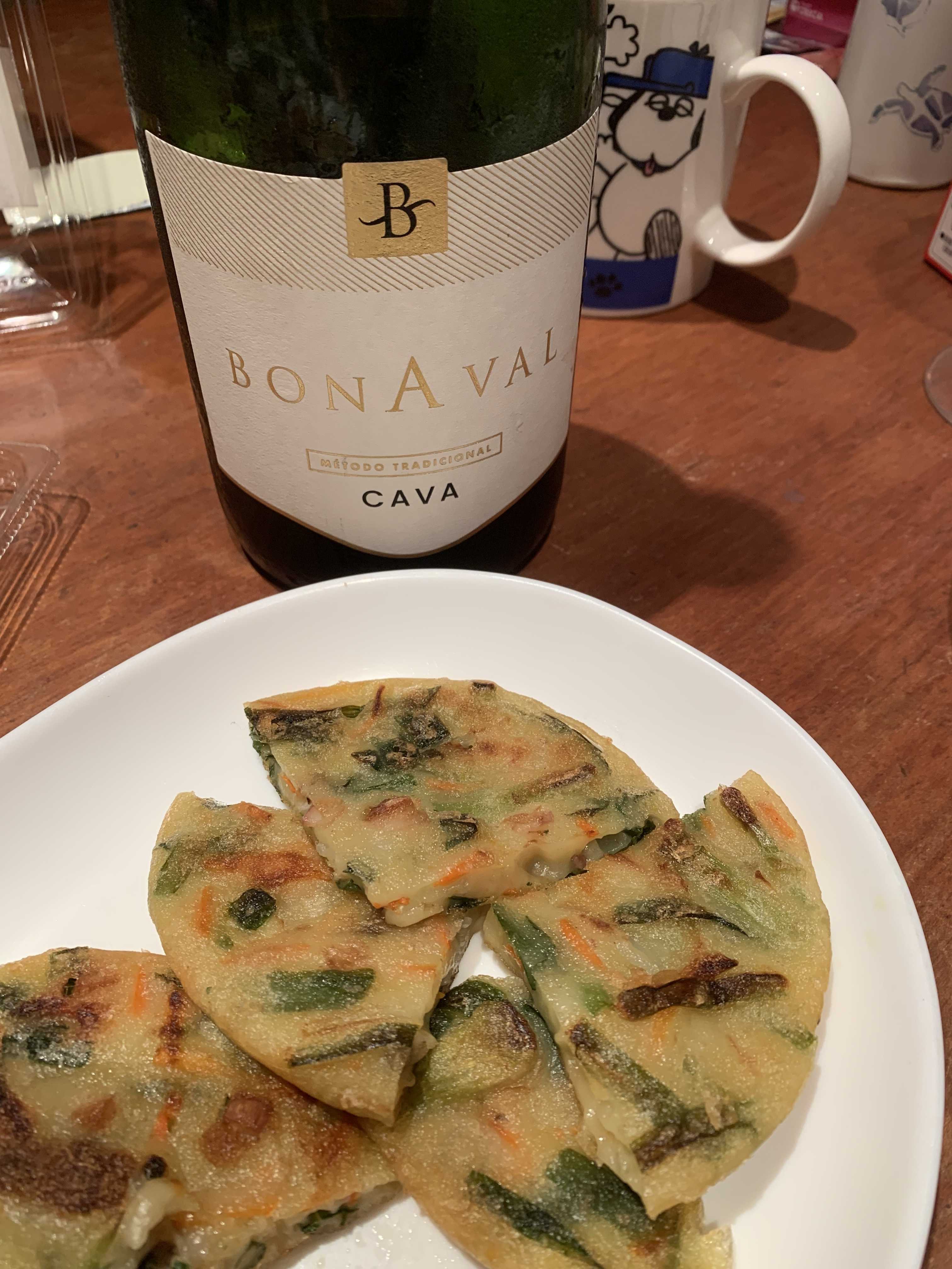 伝統技法の瓶内二次熟成のカヴァ。カヴァとしてはまあまあ泡が細かいため喉越しスムース。なんでも合う感じ。カクヤスで税込750円ぐらい。コスパが凄い。