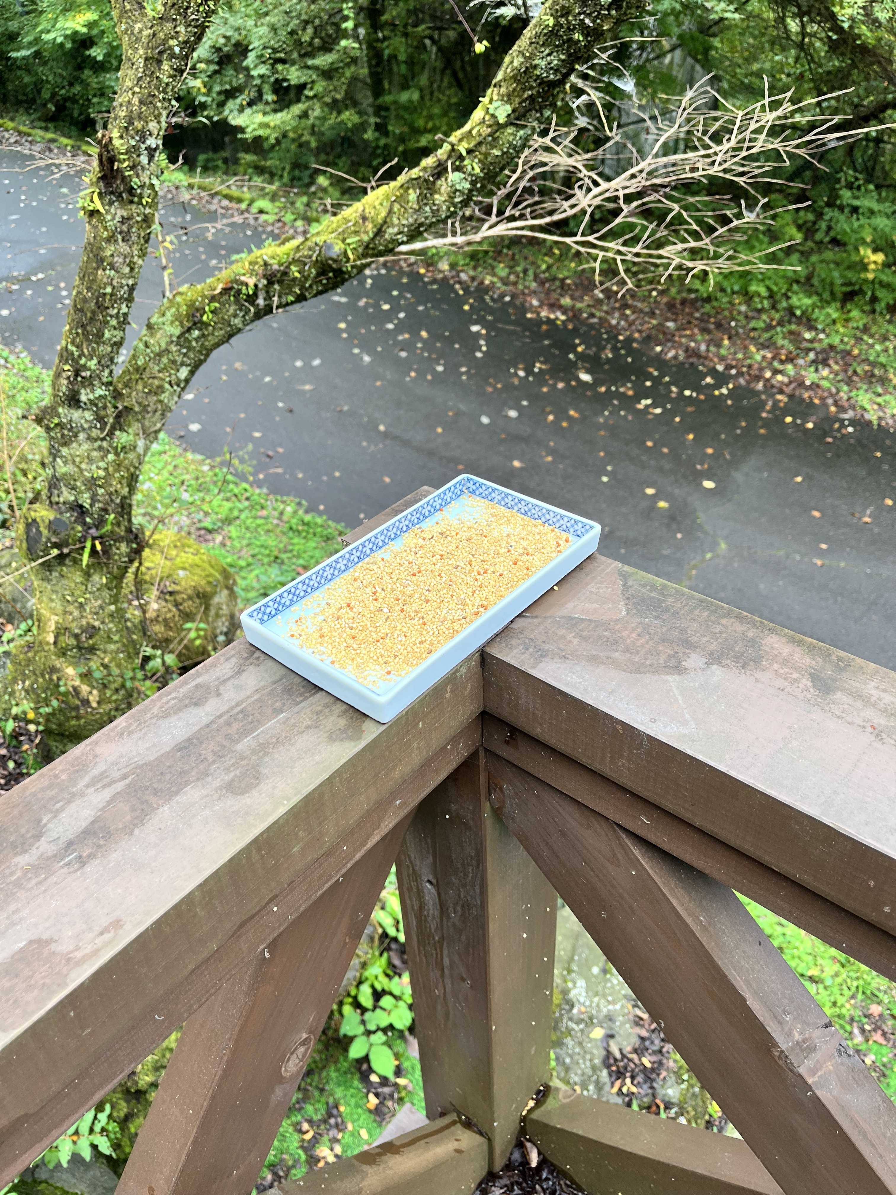 【ウッドデッキに鳥の餌場設置】雨も止んだので、ウッドデッキの手すりに野鳥の餌場を設置風呂場の給湯器の上に、またもやスズメバチ🐝が巣を作っていたので、業者に依頼して駆除完了!山の生活ってそんなもんです#山荘ライフ #secondhouse #野鳥が集まる庭をつくろう #スズメバチは来ないで