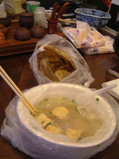 先日知合いの会社を訪問した時の事。 「何?お昼まだ?じゃ、一緒に出前でも取ろうか?」 と、取ってくれた出前の内容がこれ↓ 焼き餃子4個と厚揚げ入り春雨スープがセットでなんと6元(約80円)! 春雨スープは、非常にあっさりしていて単独で食べるとあまり味がしない位に感じるのですが、ちょっと油がきつい餃子と一緒に食べるとちょうど良い感じ。餃子の方も皮は分厚く、日本の餃子を期待するとちょっとダメですが、その分腹持ちも良さそうな感じです。 上海の料理って、日本人の口に合いそうでいて、ずっと食べていると、意外に甘さや脂っこさが響いてきて、最後には敬遠される事が多いようですが、そんな方には「小吃(=ちゃんとした食事でなく、ちょっとつまむような軽い食事、『スナック』という訳をする事が多いようです)」って結構合っていると思うんですが…。 因みに、上海で有名な「小吃」と言えば『小篭包(ショウロンポウ)』や『生煎(別名:焼きショウロンポウ)』、『ワンタン』、『両面黄(かたヤキソバ)』など、いろんな種類があります。値段の方も、単品が2元(28円)~15元(200円)前後とリーズナブルなものばかり。ご旅行でいらっしゃった際には、一度お試し頂く価値ありと思います。