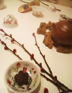 梅です。2月は梅デス。梅尽くしでございますw 梅型のプーアルに、梅柄の飲杯。梅柄の茶葉入れに、梅と鳥の紫砂壷。大胆に梅(本物)を配置。ミモザの黄色で明るく。他はシンプルに。主役は梅ですから♪デザートは黒糖チョコレートケーキ。抹茶クリーム、チョコレート、アーモンドでお皿を飾り、抹茶パウダーをふりかけましたw黒糖と抹茶で「和」テイスト。今月のお教室の紅茶と、バレンタインデーに合うデザートにしました☆2月のサロンは最後の週に空きがあります。極上のティータイムでまったりして下さい。