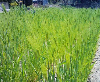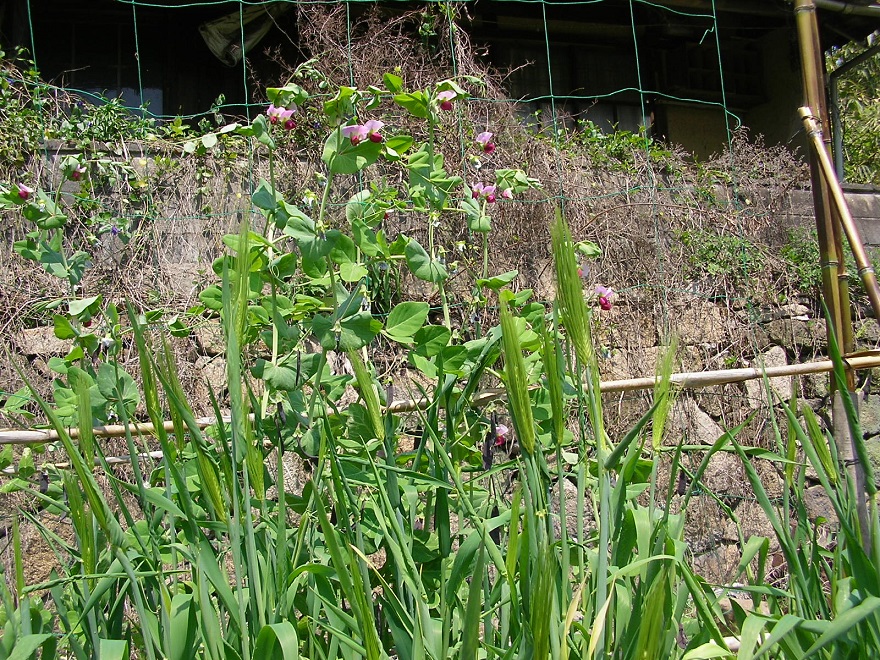 5月に入り 麦の穂が 出だした。観賞用に 少しだけ 種をまいてみた。後ろのエンドウは 黒エンドウだ。まだ 食べてないので 味はわからない。珍しいので 友人から 種を分けてもらった。