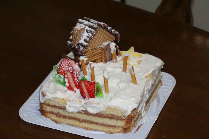 今日は トシ子さんが 午前中 ケーキ教室に 行った。作ったケーキが こちら。すこし 甘いが おいしく食べました。