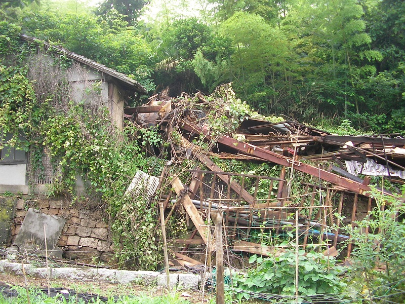 先日来の大雨により 島の敷地裏の家が 倒壊していた。我が家の 敷地には 瓦が 落ちてきていたが予想してたほどの被害は なかった。もう10何年も 空き家になっていて、もし倒壊して敷地内に倒れこんだら どうしようと思っていたが・・・・・・