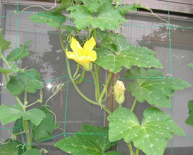 久しぶりの日記です。今年作ったグリーンカーテンは?家内が まいた種からは?ゴーヤだとまいた種が・・・・・・どうも違うような葉が出てきた。パソコンで調べると ゴーヤにもいろいろな種類があるようで。そのまま大きく育てることにした。なかなか伸びてくれない。花が咲き始めたが、まだ雄花ばかり。本当に ゴーヤなのかな、カボチャの花のようだが?