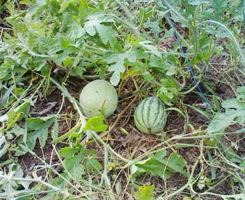 西瓜畑の草取りをした。草の中から 軟式野球のボールぐらいの西瓜が 5個。今年は 西瓜を20個ほど収穫したが、まだ出てきた。はたして 大きくなるかな?