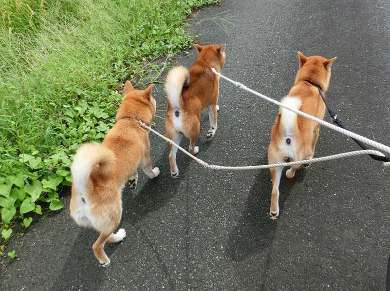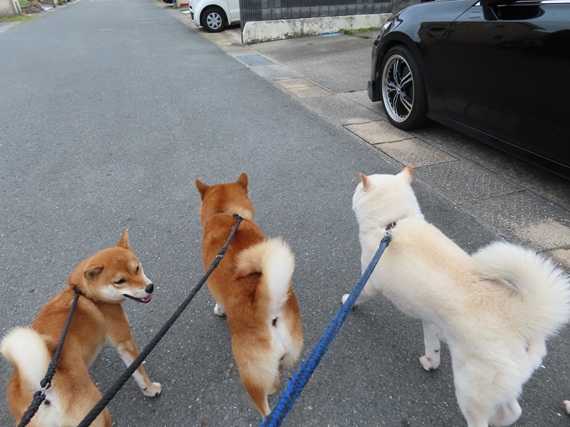 朝の散歩風景。今朝も最終組となったナナ未来コンビに獅童を加えてロードワークへ出かけてみることとしました。ここにきて少しずつ走りに力強さが出てきた様にも感じられる獅童。終始女衆の後塵を拝す格好となっていたこれまでの走りから、積極的に前に出る走りをコース序盤でみせてくれる様になってきました。(嬉)少しずつ体力もついてきて、みんなで走る楽しさみたいなものが獅童にも実感できる様になったことも今回の合宿での収穫のひとつだったりするのかな?交差点での信号待ち時にこちらの呼び掛けにカメラ目線で応えてくれた獅童を眺めながら、そんな楽しい想像を巡らせてしまいます。コース途中で3匹揃っての一枚を撮ってみました。ナナそしてミイ、今回は獅童のロードワークのお供を務めてくれてホントにありがとね!本日最後の一枚は、この日、ご家族のお迎えにより帰宅の途に就いた獅童。やってきた当初はワガママ王子モード全開な坊に先が思いやられる感満載!?って感じがしていましたが(笑)、その後スムーズに我が家の空気に溶け込んで、群れの一員として機能する獅童の逞しさを目にして、ちょっぴり頑固な反面、素直で仲間思い、といった獅童の本来的な持ち味は錆び付いてはいない♪そんな実感に包まれながらこの3週間を私たちもまた獅童と楽しく過ごせた気がします。(楽)そしてそれはきっと獅童のことをよく理解して獅童との時間を大切にできるご家族に獅童が恵まれたことに因るところが大きいのでは?そんな楽しい想像が自ずと膨らんでしまいます。今回の我が家でのひとときが、獅童の中で楽しい思い出のひとつとなることを願ってるよ。そしてまた、これからもいつでも遊びにおいでね、我が家の面々と獅童がやって来るのを楽しみにしてるからね!