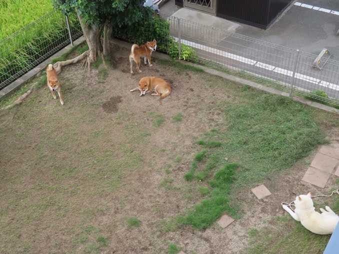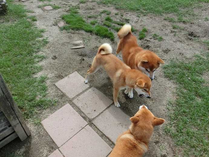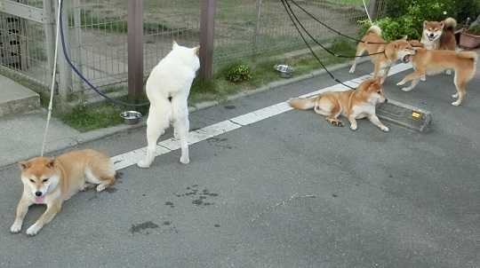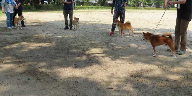 朝のひとコマ。今日も朝食を済ませたのち、庭先でみんな揃って朝の微風を感じながら、庭番に就く前のひとときを思い思いに過ごす面々の姿が見られます。こちらは2日前の夕方の散歩時に左後肢を怪我してしまったハル。(泣)当初は三つ足歩行する姿を見せる等、怪我の具合が心配されましたが、患部とみられる中指の間に負った傷の状況とその後の歩様を見ると、春に怪我を負った時と同じく、大事には至っていないと判断できるものであったことから、傷口が塞がり違和感が解消するまでの間、ハルには結とともにしばしナツの散歩のお供を務めてもらいながら、私たちものんびりペースでその調整に努めることとなりそうです(安)。今日も程なくしたところで、ナナ先生とカイ爺によるミイの朝稽古がスタートしました。ロードワークの疲れなどどこ吹く風~♪といった様子でエネルギッシュな3匹の覇気を伴った動きが我が家の庭に一層の賑わいを齎していく様子を妻と眺めながら、この日はナツファミリーの勉強会を開催するべく会場となったチクロスへと出掛けました。今回は前回の勉強会のおさらいも踏まえて、天然記念物でもある日本犬についての基礎知識そしてそれを飼育する上での考え方に触れた上で日本犬標準の前編をテーマに御話をさせて頂きました。勉強会を重ねるごとに少しずつ皆さんの日本犬についての意識と関心が深まり、未来志向で愛犬との日々を満喫できるご家族の方が増えていくことを願いながら、今後も皆さんとこうした学びの場を持ち続けることができればと思います。今回もお集まり頂きましたファミリーの方々には感謝の気持ちで一杯です。皆様、本日は誠にありがとうございました!