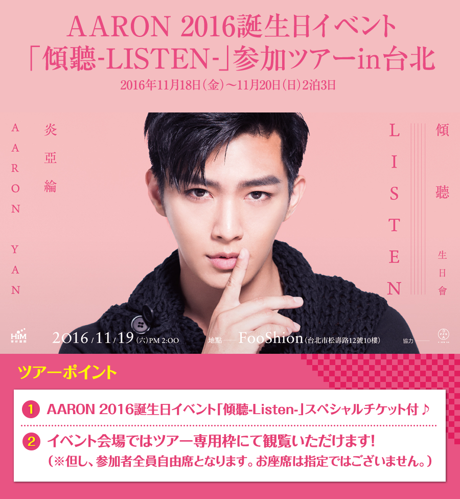 契約切れだそうです。2年間、ファンクラブ限定のファンミやライブなど、楽しませてもらいました。内容的には満足だったけど、やっぱり寂しいな。アーロンの短期留学もあるから、いい区切りかも。そして、連絡先は、☆TASIAが引き継ぎ、ファンサイトも継続するそうだから、そんなにがっかりすることはないかもしれません。☆TASIAに引き継がれるなら、その分会費も節約になるし…きっと☆TASIAでまたファンイベントを計画してくれると信じています。さて、アーロンがリンクしたfacebook情報によると、今、大陸で撮影していて、終わったら、10月末には渡米。でも11月19日の誕生日には300人限定の誕生会を台北で行うそうです。そのために自費で一度台湾に戻ってくると~~私は行けないけど、嬉しいですね。(本当はこういう会にも日本のファンクラブから申し込みできたらいいのにね。)