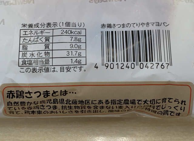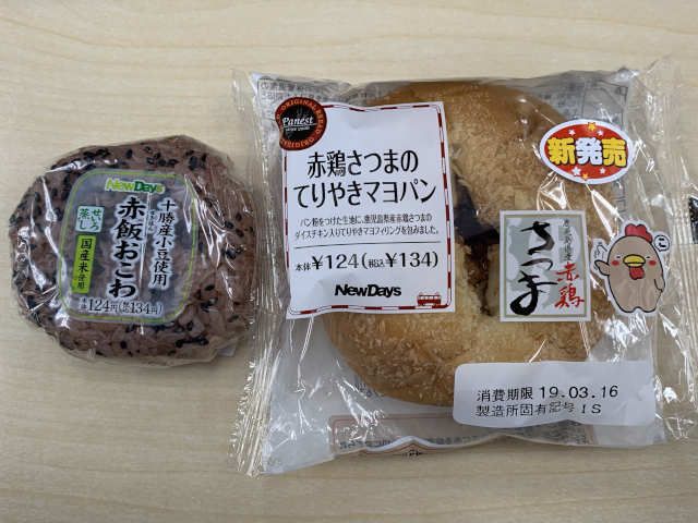 そして3/15の昼食です。赤飯おこわは腹持ちが良い感じで、時々食べていますよ。珍しくご飯がちょい硬めでした。そしてフェアの対象品が”赤鶏さつまのてりやきパン”です。