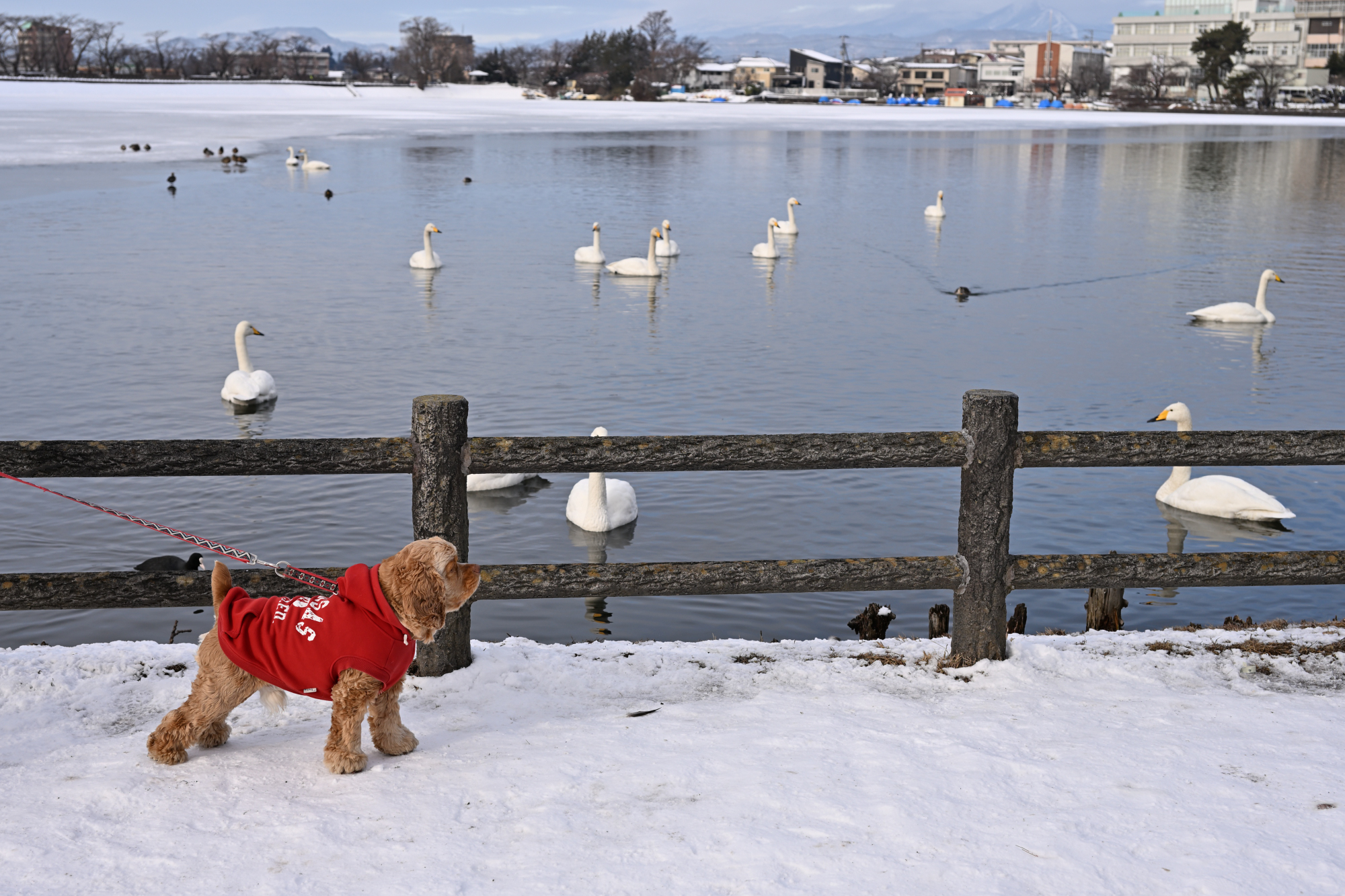 ハクチョウたちはジュリオにちょっと警戒してます。