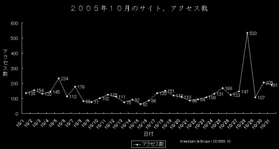 『愚かでいいのだろう。見渡す夢の痕、さようなら蒼き日々よ』(angela/Shangri-La)2日...。今日は11月2日(水曜日)。好きな声優、石田彰さんのお誕生日である。彼の主演作品はたくさんあるが、私はその中で、もっとも『機動戦士ガンダムSEED』のアスラン・ザラが好きである。保志総一朗さんの、キラ・ヤマトと同じくらいに。今日は、OA事務という授業の作業をしていた。電卓で計算したり、ペンでいろいろと部署名やら、何やら書いていったり。なんとか、課題1を終わらせた。かなり時間がかかってしまった><;昨日、テレビで都道府県のランキングがあっていたので、見ていたら、地元の佐賀が出た。ワラスボとかムツゴロウを食べるところを見て、私はビックリした。食べたことがないから、というのもあるからだと思いますけど。あとは、頭がよくなる県のベスト5位に入っていたし、土地の値段かそんなものでもベスト5位でした。しかし、梅宮辰夫さんが、佐賀に来ての「食いしん坊万歳」で、何もコメントしなかったらしく、それが20年ちかく前のやつ。それで、今現在のインタビューで、「まずかったんでしょうね」って言った。正直、殺したくなるほど許せませんでした。その発言。普通テレビで言うか?んなこと。佐賀県民に土下座して謝ってほしいくらいです。佐賀をバカにしてるんですか?って言いたい。じゃあ、もし梅宮辰夫さんの地元の料理を「まずい」って言ったら、梅宮辰夫さんはどう思うんでしょう。「そんなことどうして言うの?」って思ったら、その時点で、あなた(梅宮辰夫さん)は人間失格です。人のこと言えません。いい加減にしてほしい発言でしたよ。ムカツきました。ではではvまたvv今年、10月のアクセス数をEXCELで作ってみましたvvこんな感じvv