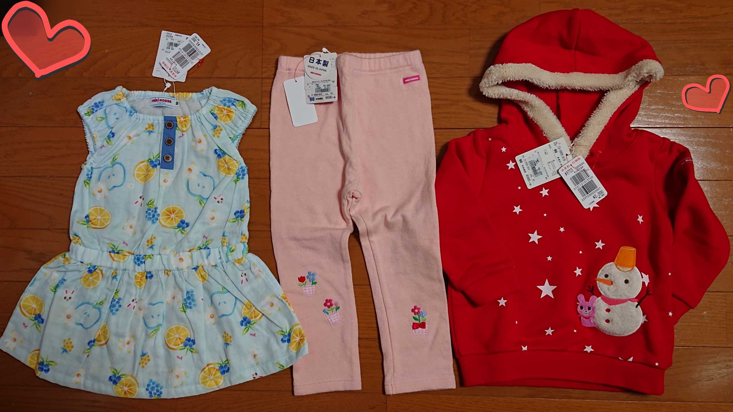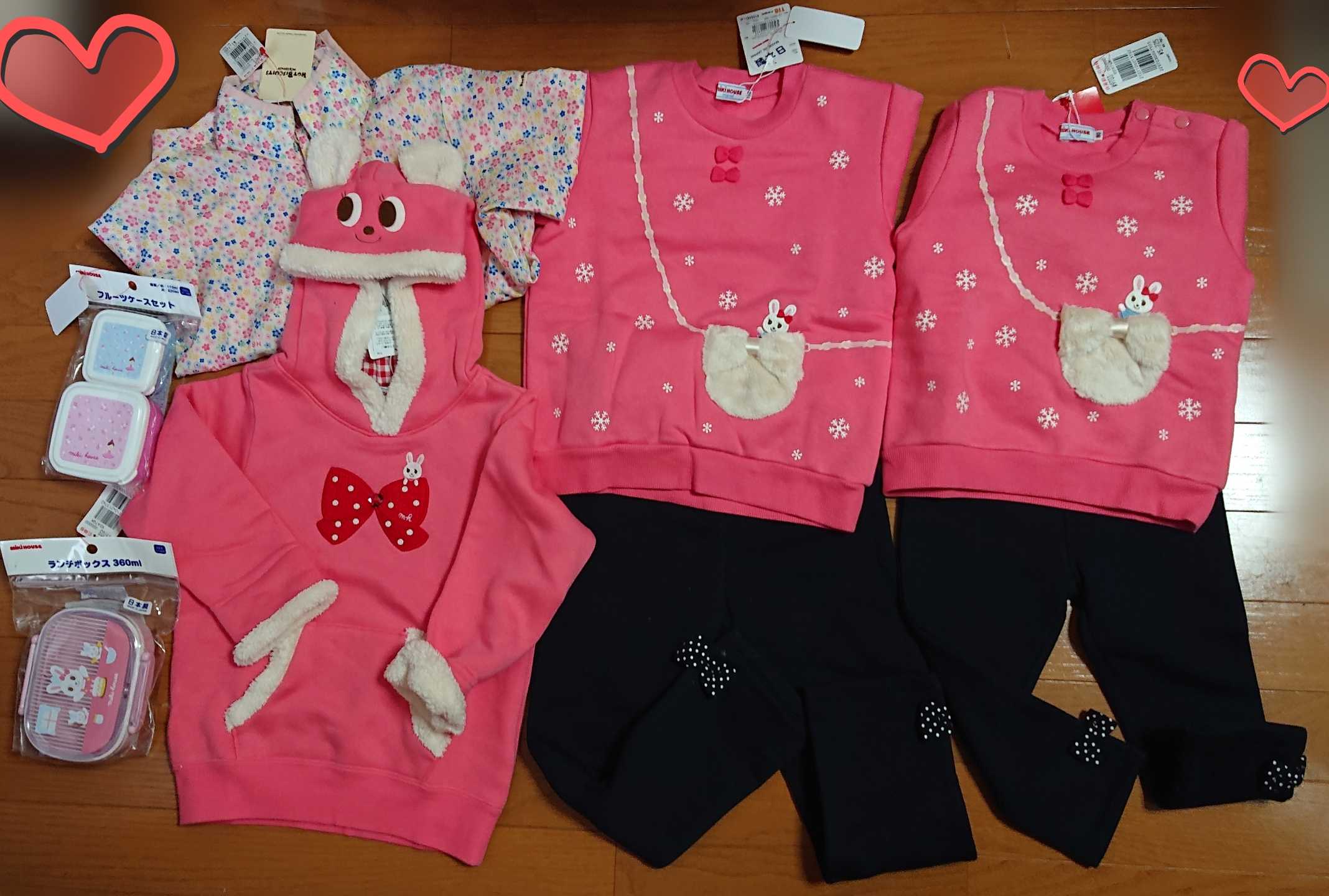 マラソンで盛り上がっているところ恐縮ですが、本日からのオンワード大阪に行って来ました!今日は朝一には行けず昼前からの出陣のため、いいものは残ってないだろうし、収穫ゼロかもしれないけどとりあえず様子見がてら行くことにしました😅まず、結論から先に書きます。今までオンワードの目玉だと思っていた、B級品の2200円3300円均一はなくなってました。B級品はありましたが、ミキハウスランドと同じ価格帯でした。前回までのオンワードで2200円や3300円だったものは、値上がり(いつものB級品)価格ということになります。ついてすぐ、B級品ワゴンを目指した私はがっかり。破格のB級品がないなら買うものないなぁ…と思いきや。なんと!!B級品じゃなく、普通の正規品がほぼオール半額でした😵正確には、50~30%オフと記載されてあったのですが、ざっと私が見た感じでは、ほぼ大体半額でした。えーーー😱正規品半額って、それもうミキハウスフェスティバルやん。それは先に言ってよ。。。というわけで、掘り出し物のB級品を狙うつもりで行ったら、急きょ一人ミキハウスフェスティバルになってしまい、色々計画が狂いました(笑)🤣←主に予算。*正規品の90~110をざっと見たところ、90と100はまだそこそこうさこが残っていましたが、110はボトムスにワンポイントうさこがあるものが2点のみ。大きいサイズはもううさこないのかな?と思い、念のためスタッフさんに確認。すると裏から、うさこの付いた全商品(トップス、ボトムス各4~5点ずつ)持って来て下さり、更にお揃いで90も探してる旨を伝えると、90のうさこ全商品も出して下さりました💦本当にありがたいです🙏おかげさまで、可愛いトレーナーお揃いで買えました😍*前置きが長くなりましたが、本日の購入品です。右から左に向かって紹介します。記載価格は全て税込です。(B)とあるものは、B級品です。MHポシェットトレーナー90 10450円→5225円MHポシェットトレーナー 110 11550円→5775円HBリボン付き裏起毛パンツ90 3190円→1595円HBリボン付き裏起毛パンツ110 3520円→1760円HB花柄ウィンブレ(B)120 4620円→1100円MH耳付きトレーナー(B)110 13750円→5500円MHランチボックス 1430円→715円MHフルーツケース 1100円→550円以上、総額22220円のお支払いでした!正規品は全て半額です。B級品は2点のみの購入です。*ポシェットトレーナーアフィありません。品番13-5603-268。初めて見たデザインなんですが、結構古いものなのかな?うさこのポシェット柄といえば、似たデザインの↓こちら【セール30%OFF】ミキハウス mikihouse ふわふわモチーフ☆裏起毛トレーナー【13-5604-957】 【mhs】はずっと気になってお気に入り登録していたものの、我が家は福袋でも出会わず買い時を逃し、購入に至らなかったもの。今回、同じようなデザインのものが半額でお揃いになったので満足です!ホットビの裏起毛パンツはこちら。【お買い物マラソン期間限定40%OFFセール】ホットビスケッツ(HOT BISCUITS) ドットリボン付き♪裏起毛パンツ(80、90)ホットビのボトムスがあんまり手持ちになくて…。スウェット素材の、ガンガン普段使いにできる履きやすい(そしてお安い)ホットビのボトムス探してました。これも110しか出てなくて、90は在庫から出して頂きました!こちらはB級品。1100円だったので買いました(笑)【冬物クリアランスセール】【40%OFF】ホットビスケッツ(ミキハウス) Hot Biscuits by MIKIHOUSE ウィンドブレーカー【メ-ル便可】【キッズ】【ベビー】120なので、長女が小学生になってからかな?何となく小学生って、こういうのが一枚あれば重宝するかと思って…😅こちらもB級品。今までのオンワードだったら、3300円くらいで売られていたかもしれませんが、今回は5500円です。2/4 20時から全品ポイント10倍!【セール30%OFF】【メール便不可】【MIKIHOUSE ミキハウス】うさこ&プッチー 耳付きトレーナー(80cm・90cm)でも、可愛いと思ったからいいんです。こういうなりきり系のフードも、長女は着てくれるタイムリミット近いと思うので…。サイズのある今のうち。そうなると次女分も欲しくなるなぁ。次女こそ、着たら絶対可愛いお年頃。(え)ランチボックスも半額(50%OFF)プッチー&うさこランチボックス(お弁当箱)(360ml)(うさこ・プッチー)ミキハウス mikihouse私が見たときはこの柄だけでした。違う柄もあればもう一つ買おうと思ってましたが、ダブルビーも含めこの柄しかなかったです。(男の子は覚えてません…ごめんなさい。でも何かしらの、男の子のランチボックスもありました!)フルーツケースも半額。【ポイント10倍】〇【ミキハウス】【SALE】フルーツケース1000【3,980円以上で送料無料(国内)】小さい水色の方がすぐに使いたかったので、ピンクの方はしばらく寝かせます。(男の子の方も、この車柄のやつがあったと思います。)*そんなつもりなく行ったので、思いのほか選別に時間がかかり、一時間半ほど滞在でタイムリミット💦結局ミキハウス以外は全然見られなかったし、ミキハウスももう少しじっくり