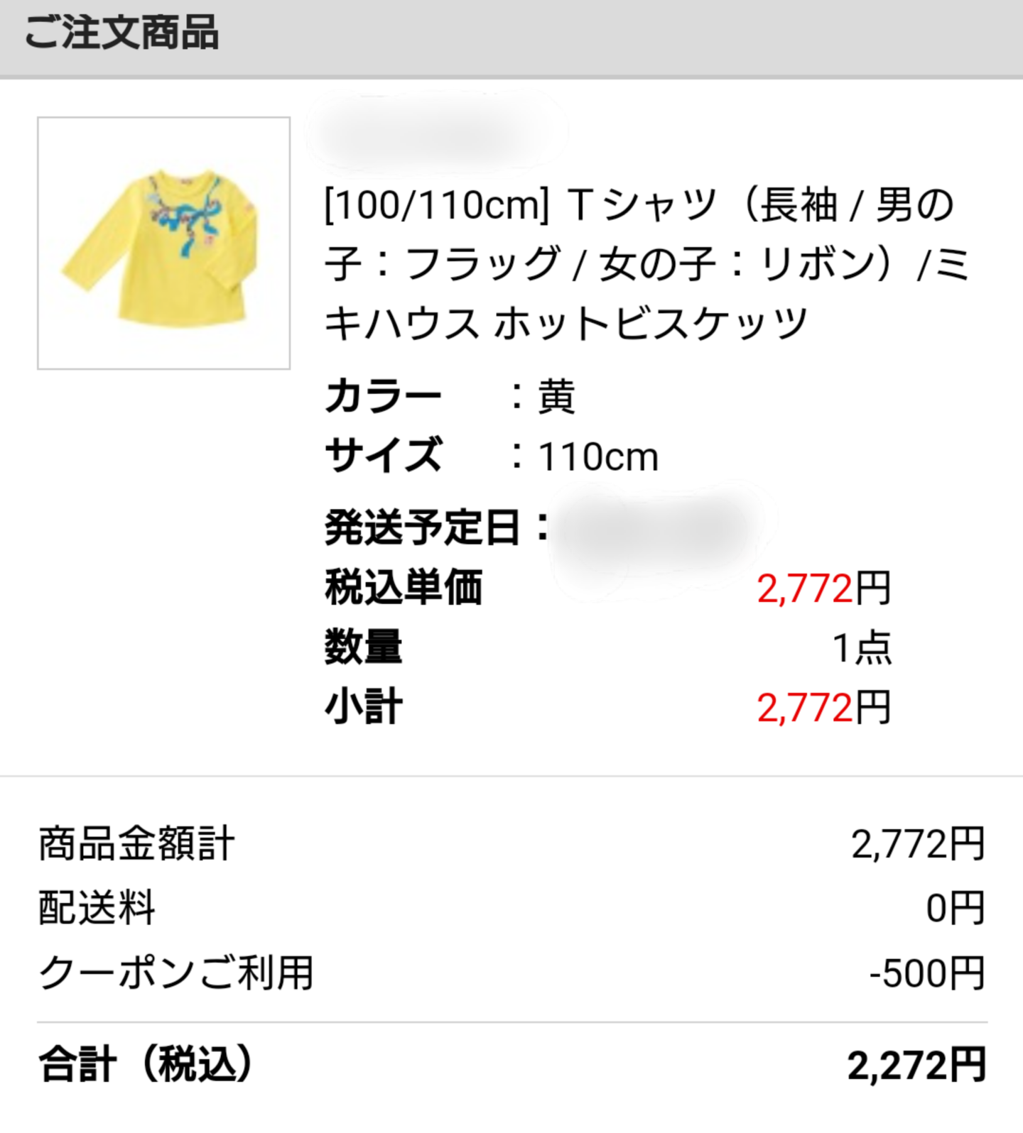 昨日ブログ書きかけで寝落ちしてしまいました…💤日付変わってしまいましたが、せっかく途中まで書いたので載せたいと思います。昨日は楽外マ○イでお買い物🎵クーポン豊作のゾ○さんでもなく、15%オフクーポンが魅力的な公式さんでもなく…😅初めゾ○さん物色してて、これ7000円くらい以上なら公式さんの15%の方がお得やんと気付き、公式さんも再び物色。先買いを検討してたのですが、結局私の欲しかった色/サイズがちょうど売り切れで😱姉妹お揃いで2着買おうとすると、片方でもサイズが欠けてると断念せざるを得ない💦それでまあ、ゾさんと公式さんを行ったり来たりするわけですが、結局購入には至らず。マ○イさんでクーポン色々出てて、お気に入り登録してたから2000円以上で500円オフが私は出てたんです。大体マ○イさんって、クーポン3000円以上からのことが多いので、2000円台以下の商品購入は後回しにされがちですが、ちょうど欲しいものがあったので500円クーポン使用でポチしました!ホットビの黄色にリボンの長袖T、110。【メール便OK】【HOT BISCUITS ホットビスケッツ】フラグ&リボンプリント長袖Tシャツ(80cm・90cm)【ミキハウス】以前ミキハウスランドで90をB級品でゲットして、長女分も追加するかずっと悩んでました。楽内でももう110は買えるところないですし、マ○イさんでも本当にラスト1点。買えないと思うと、ラス1だと思うと、買っておかないといけないと思うのは何故でしょう(笑)🤣無事買えたみたいで良かったです🎵そろそろロンTの季節ですからね!また在庫整理しないと…😅