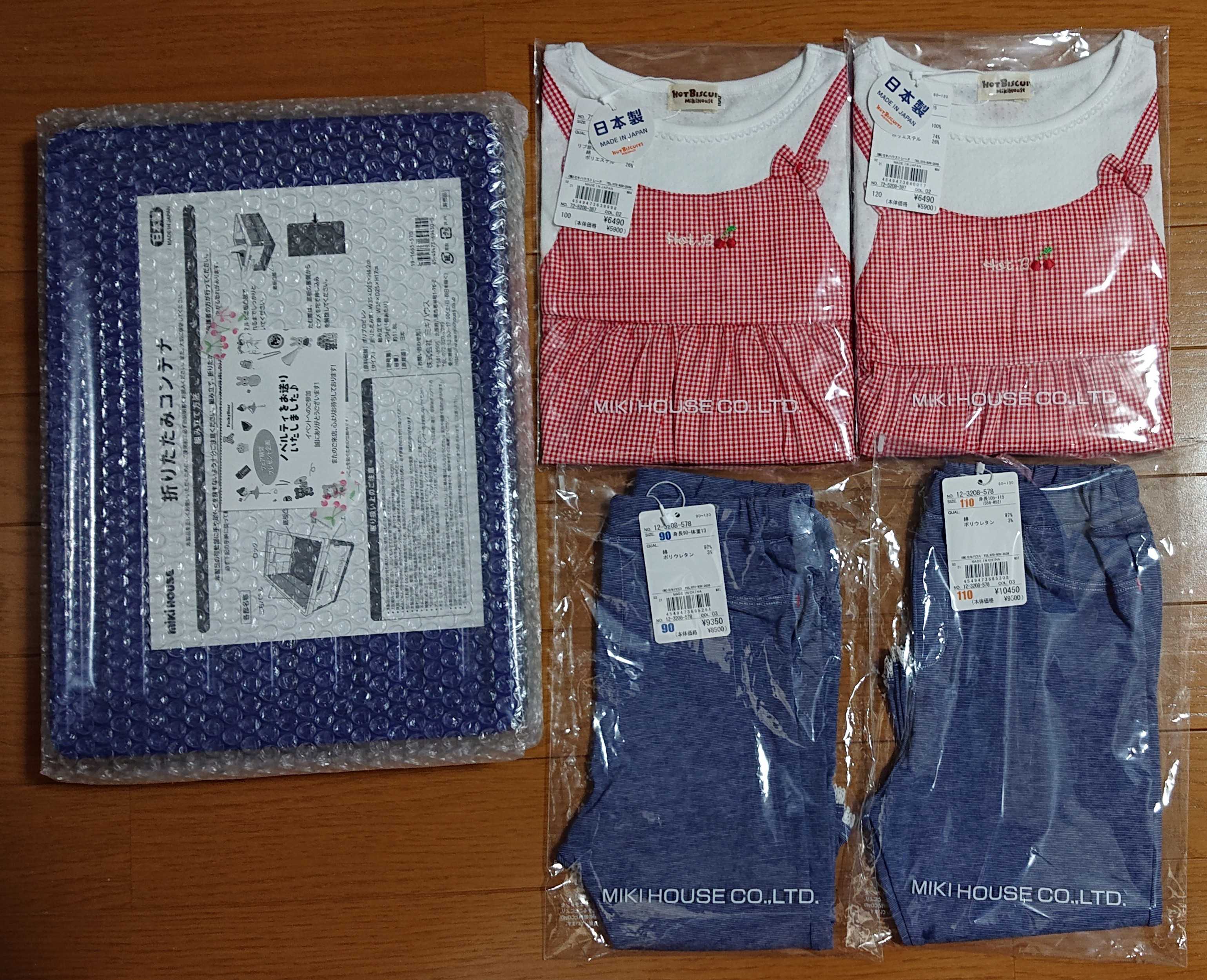 楽内で夏フェアに参加した分、到着しました!ポッキーさんで購入しました。こちらです✨わーい☺️どれも可愛い♥️*ボトムスは今すぐ履かせたかったので、ジャストの90/110にしました。【24日〜ノベルティ対象】【セール30%OFF】 ミキハウス mikihouse 7分丈パンツ ボトムス パンツ ストレッチ 刺繍 いちご レース かわいい ベビー キッズ 子供 女の子 (80-100cm) 【12-3208-578-80】【24日〜ノベルティ対象】【セール30%OFF】 ミキハウス mikihouse 7分丈パンツ ボトムス パンツ ストレッチ 刺繍 いちご レース かわいい キッズ 子供 女の子 (110-130cm) 【12-3208-578-110】裾にデザインがあるボトムス、手持ちにないので新鮮です。腰のワンポイントうさこだと、どうしても隠れてしまう率が高いので💦トップスは先買いの100/120。【24日〜ノベルティ対象】ミキハウス mikihouse ホットビスケッツ 重ね着風半袖Tシャツ 半袖 ストライプ ギンガムチェック リボン かわいい おしゃれ 春 夏 ベビー キッズ 子供 女の子 (80-120cm) HOT BISCUITS【72-5208-387】これ本当に良く考えられたデザインだなぁと思います😍赤の方はギンガムチェックで、ブルーの方はストライプなんですよね。どっちも絶妙な可愛さです🍒ノベルティーはコンテナです。ポッキ—ベア2022☆サマーフェア ノベルティ プレゼント ヘアアクセセット バンダナ 保冷バッグ ピクニックセット パズル えほん 絵本 折りたたみコンテナ レジャーシート クーラーバッグ思ったより大きくて、使い勝手良さそうです😄画像みたいにこれ持ってオシャレなピクニックしたいけど、現実問題、小さい子供連れてのピクニック(公園)って、こんなオシャレなボックスにお弁当入れて優雅に過ごせないです😅食べさせるのも、自分が食べるのも戦争…。最低でも片手は空けないと、両手塞がるコンテナでの移動は困難…。*そうそう、この夏の姉妹ズ服のサイズ感を迷っていますが、せっかくの新作だし、↑ホットビのトップスと先に買っていたモデルコーデのボトムスを試着させてみました!タグ付きのまま着せてます。次女が非協力的で全身写ってるの後ろ姿しかありませんでした。(でも、前後ろ両方分かるから、これはこれで良かった?)●長女身長103センチ→上下共に120着用●次女身長85センチ→上下共に100着用トップスは、やや身幅が大きい感はあるものの、チュニックっぽい服ということもあり、ほぼ違和感なし🙆ボトムスも、丈感や身幅の広がり感はやや大きめなものの、ゆるっと履くデザインも結構好みです。が。いかんせんウエストがゆるいんですよね。二人とも、履いたあとソファーで4~5跳ねしたらもうキュロットずり落ちてました(笑)🤣ですので、トップスは今夏から着せます!ボトムスもウエストのゴムを詰めれば着せられるんですが、私がそんな手間なことをするとは思えないので、多分来夏からになりそうです😅