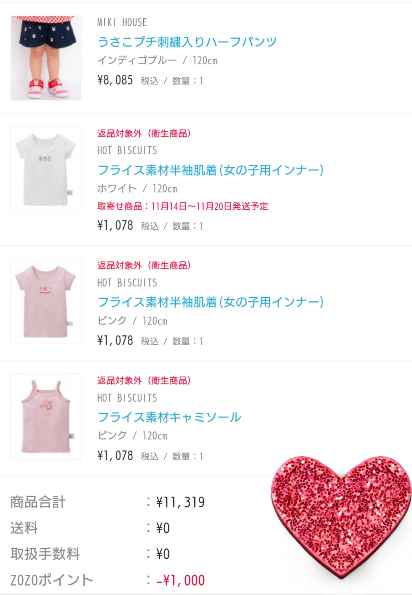 ゾさんの1000円クーポンを使ってポチしました!さっきペイゾで見たら売り切れてて、普通のゾさんの方で買いました。朝イチはペイゾでも売ってたんですけどね…。さっき見たら売り切れになってて、ペイゾは夫のアカウントのが圧倒的に還元率いいので頼むことになるのですが、いかんせん今日は次女の七五三で朝からもう大忙し💦二人ともゆっくり携帯触る時間がさっきまでなかったので仕方ないです。で、肝心の購入品はこちら。プチうさこパンツは、私もサイズアップ確保しました。120です。ミキハウス正規販売店/ミキハウス mikihouse プチうさこパンツ(80cm・90cm・100cm)今、姉妹ズに90/110履かせているのですが、やっぱりサイズアップ欲しくて、とりあえず120は確保しました☺️100もどこかで買うかどうか悩み中ですが、そんな90~120まで全サイズ揃える必要があるのか?次女は90のあと100をすっとばして、お下がりの110にいけないか?様子見です。まあ100を手持ちの110で賄うことは可能ですが、120は買うしかないので買いました😅あと10000円以上で送料無料ということで、ホットビの肌着を3枚。ホットビも2点以上お買い上げで20%ポイント還元ということだし、120の肌着は30%オフでも在庫なくて買えないことも多いので、お得かな?と思い…。これの、白とピンクの120。【セール30%OFF】ホットビスケッツ(ミキハウス) Hot Biscuits by MIKIHOUSE 半袖Tシャツ【女児】【肌着】【通年】【メール便可】【キッズ】【ベビー】これのピンクの120です。【セール30%OFF】ホットビスケッツ(ミキハウス) Hot Biscuits by MIKIHOUSE キャミソール【女児】【肌着】【通年】【メール便可】【キッズ】【ベビー】 肌着は色々試しましたが、やっぱりリピしたいと思えるのは今のところミキハウス系一択です。120の肌着は出番は多分半年後くらいですが、まだまだお得なときに在庫増やしたいな。今日の七五三の話は、また後日書こうと思います。大変でしたが、何とか致命的なトラブルはなく終わりました…🌀疲れた。。。😖💦