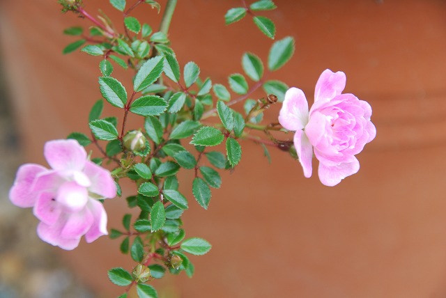 庭の鉢植え、ミニつるバラが咲き始めましたバラの種類って、すっごくたくさんあるらしいですね私は詳しくないのですが「修景バラ・真珠貝」という種類みたいです!