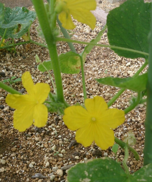 きゅうりの花が咲きました。スマホ撮影です。びみょ~にピントがズレてますね・・スミマセン
