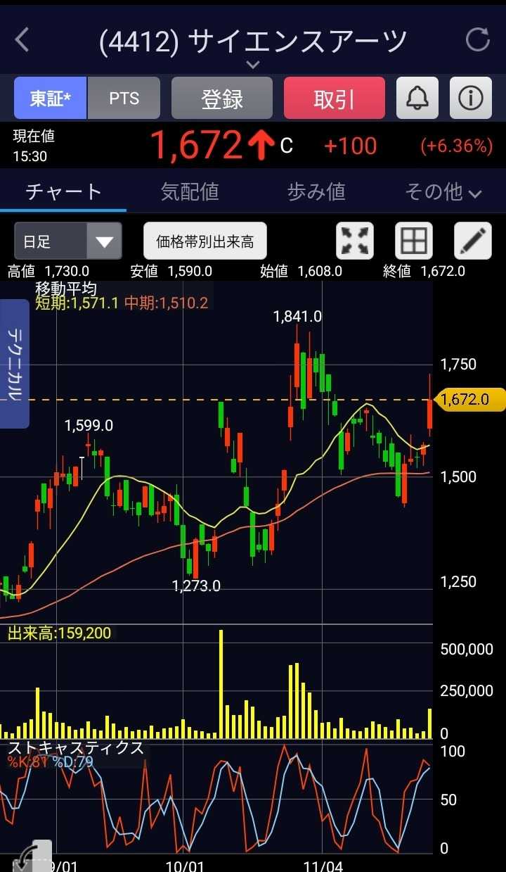 サイエンスアーツが、+100円(+6.36%)、