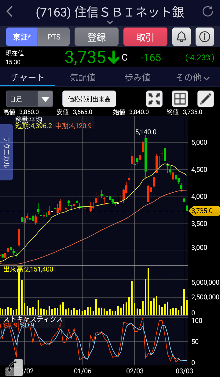 一方、住信SBIネット銀行の株価は下落が止まらず、