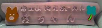 カンバンは天然木に木彫りの文字やイラストを配したもの。