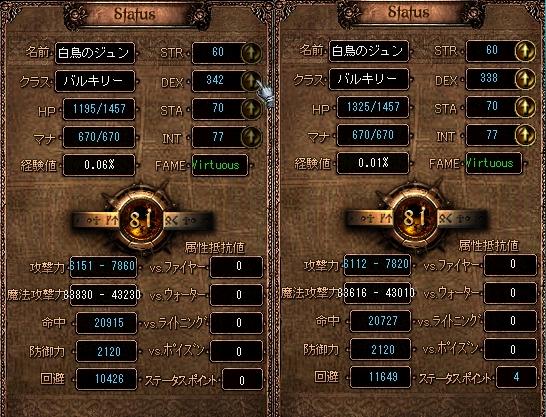 まずはどうでもいい事から・・・↑明らかにスキルじゃないよねorz前回79LVになったのが10/24の12:07(10/25 0:07)だったのですが80になったのは10/27 1:44(10/28 1:44)と早めのUP(神1.5 フリポしようb目標は土日で83ですけどねbLV80といえば種族別装備ですね!でもまずは80になったときのSS 次がDEXを4追加したとき上が変更前で下が変更後です装備は・・骨がALL+1一次色(頭は+5二次 鎧は+10侍 アヴァペンは+7ゲルはALL+5一次色 ペチュは+2・6・7 ですねbこれはゲルの見た目・・(頭から サーペン グリ グリ グリorzペチュとかゲルのおかげでMAX超えましたw(確か41w変身後はこんな感じ土曜日は81か2にする予定b