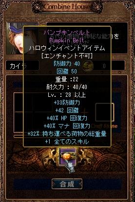 さてさてさて!遂に着ましたねこの日・・・新MAP・新武器・ペットシステムそして・・・・パンプキンイベント!!っと、浮かれていますがこの日で3日フリポ消滅w前日に血の祭壇を登録した物のイベント始まって入れなくちゃ意味無いですね^^;よって、マド狩りしてました~さて、SSに入りましょう・・・まずは前日のSSから~パンプキンに備え、侍青鎧を整理しました~どうでもいいですねwはい、コレは知ってる人は知っているクイズ王の問題の一つの答えです皆さん覚えておいてねぇ~(無駄知識orzそして、コレがその日落ちる前に成長がいった言葉もしや、パンプキンイベントのことを知っているのかもbここからは、30日ですコレは皆さん気づいたでしょう~箱開封第一弾!(第二段はなさそうですけどwマド狩りのおかげで経験地たまりなんとかUP!久しぶりにソロで出ました~その後も合成エンチャ3個ほど・・・飛空挺での出来事・・・ソロでゲットしました!でもね。。使い道が無いorz現在弦の無い弓探し中b今日の一言~倉庫の中身荒らし放題っぽいですヨォ~目指せ!KPPorQPPセット!!!
