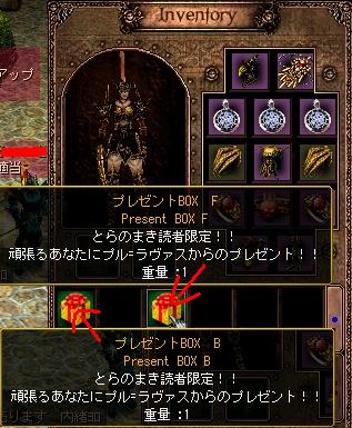 無駄にタイトル長くなってますが気にしない方針で・・・今日はインする前に、各ID(7かな?)のLV別プレゼントと残りGEM確認をしてましたそしたら、2個(4個)未使用の宝くじコード有ったんで交換したら2個がコレでした結果はこのように左がBで右がFです(ノマ円貰えるってすご・・次からはゲーム内ですバルで飛空挺に入ったときの出来事・・・(午後・・5時ごろかな?なんか、ゲートで透明化してしまいました^^;動いた瞬間色付きましたけれどw隣のマジさんは盗撮ですb(ぁお次は・・・一気に夜の出来事になります(午後11時w支援で行ったら、他の方が攻撃レイパラさんしか居らず地味に反射狩してましたが、10分後と位に次のモンスが自然に沸くみたいです一気に敵が増えて大変なことに・・・wレイパラさんは、安置の一歩手前くらいで逝ってましたorz私は、演歌とホリかかってしまった、慌てて逃げるも数が多すぎて動けなくてPOT3セット位使った気がしますw出航前はこんなところに船員いませんでしたよね~しかも・・・会話が2種類?ある模様w(ただのバグですね、はいorz間違い探しが出来そうですけど、すぐ見つかってしまいますwさてさて、予想してると思いますがこうなりました^^;滅多に?見れない船長の言葉付きですね~(戦力不足orz最後はコレで〆! シュレ人形 :9戦5勝4敗 本:5戦2勝3敗ヘイゲル人形:6戦6勝0敗 本:言うまでもありませんね(@手1個でもう1回できますwパンプキンの方は最新SS撮るの面倒になったんで書きますペンダント +9・8・7・6・5・3・1・・・各1ネックレス +10と5位しか記憶に・・(ぇあとは、PBとKクラ各1です因みに・・・金のアドバイスは安いのか高いのか280Mで売れました~(損か特か・・きっと得どうせ新素材も出回れば安くなるはずなんでキット特でしょう・・・本日の一言・・・新規でゲスクを見たこと無い人以外は知ってますとも!100万人も味方居ないから比べれませんorz・・・・・・・・・・・・・・・・・・・・・・・・・・・・・・・・・・・・・・・・・・・・・・・・・・・・・・・・・・・・・・・・・・・・・・・・・・・・・・・・・・・・・・えっと、タイトル間違えてたので直しました~ すいませんm(_ _)m