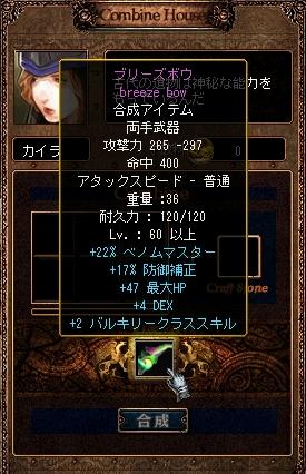 今日やったことを適当に書いてみますね~(SSあるもののみbコレは、ヘイゲル狩りを手伝う前に成長が言ったことです(それだけ・・KPNの合成初成功しました~(前回等あわせ5回目w 無論30%ですよwで、SS加工してたらコレだけになったんですよね・・・なので文字で少し・・・KPPorQPP製作用に550MでKクラ1個購入(残金約500Morz現在、PPは+9・7・5(まだorzパンベルは前回のまま1個のみパンネクは+10*2 +8*1 +6*1 (KPN1個b今日はほとんど人形&お面出ませんでした^^;+5PPは1個だけ・・・ シュレ人形 現在7戦3勝4敗 本 3戦1勝3敗ヘイゲル人形 現在4戦4勝0敗 本 100%なので無視こんなところですかね~金のアドバイスは使い道が無いせいかいまだに売れず~(マジ2次武器弦無し弓は450MくらいでPS見るくらい・・・(使えそうだしね・・・本日の一言~ 何してたんだか・・・orz