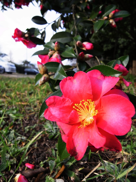 今朝は自転車でなく地下鉄で出勤したので、駅から職場まで歩くことになりました。途中、サザンカが咲き始めた場所を通りかかったら、垂れ下がって地面すれすれで花をつけている枝を発見。RICOH GXR + S10で、24mm相当の広角マクロに挑戦してみました。ピント合わせがオートのみなので、なかなかうまく狙ったところにピントが来なくて苦労しました。しかし、周囲の状況もいっしょに入る広角マクロは、今までの私のカメラライフではほとんど体験したことのない領域ですのでとても楽しいです。広角マクロならではのフレーミングやアングル、被写体を研究して、グッと来るショットが撮れたらいいなと思います。