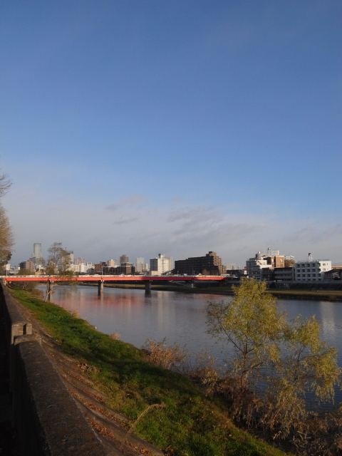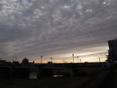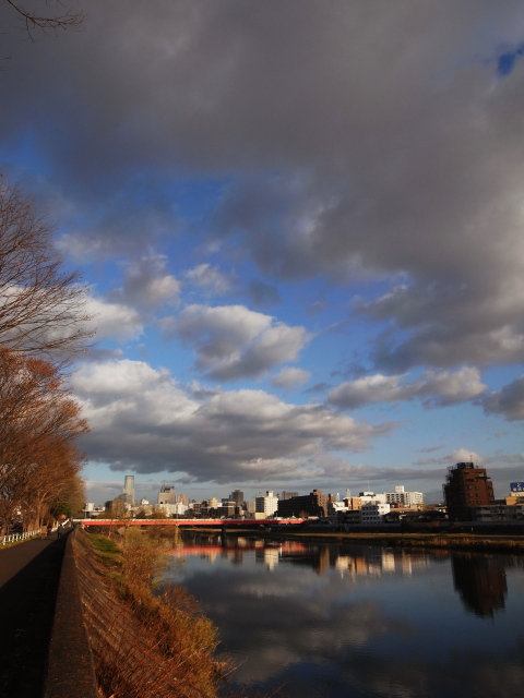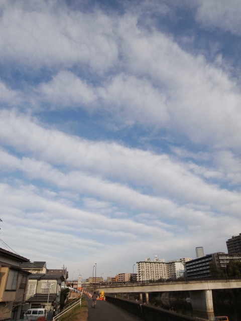 今朝の仙台も、思ったほど寒くなく自転車通勤も苦になりませんでした。いつものように広瀬川に出てみると・・・ハクチョウさんの数が増えてる!しきりにあの独特の声で鳴いています。最近常備しているRICOH GXRでパシャパシャ撮ってみたり。でも、72mm相当の望遠ではかなりきつい距離感です。近いうちに、ちゃんと(?)望遠レンズを使って撮った写真をこの日記に掲載したいです。一段落して、自転車をこぎ始めると・・・北西のほうから波のように南東へ連なる面白い形の雲が視界に。GXRの24mm相当の画角を駆使して撮ってみたのが今日の一枚です。なかなか空のダイナミック感が出ないですね。写っている橋は、愛宕(あたご)橋です。地上の風景をどういう感じに撮るかが重要だと思います。もう少し修行が必要ですね。