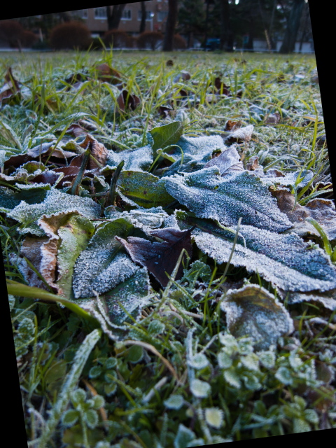 今朝は大変寒くて、日かげのそこここに霜が降りていました。今日の一枚は、朝出勤時にみかけた東北大学片平キャンパス中央広場の霜です。RICOH GXRで地面すれすれから撮っています。モニターがよく見えなかったので、かなりななめになってしまいました。7.5度も傾き補正しなければ水平にならないほど傾いていたようです。日が昇れば溶けてなくなってしまいますので、貴重なタイミングです。この日は結局、朝は霜、夜は雪というお天気でした。