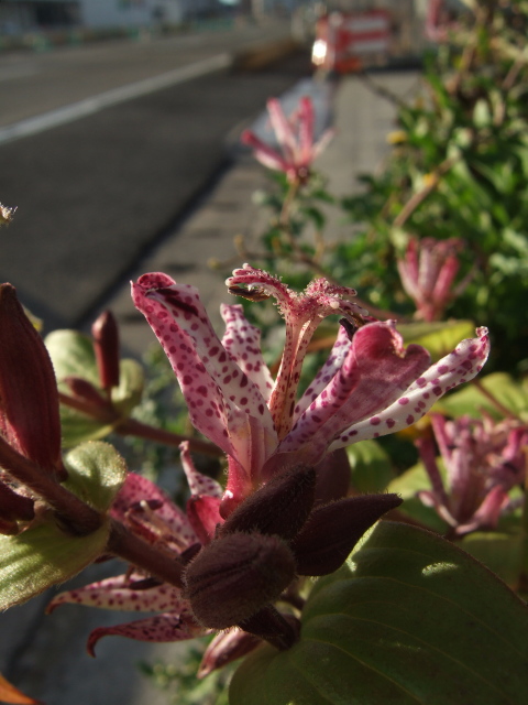 昨日までとは打って変わって、お天気な朝となった仙台。これから冬型の気圧配置が強まって、寒くなる予報でした。でも、風は強かったもののそれほど冷たくはなくて、意外と気温は高い印象でした。強風のためJRに遅れが出ているようだったので、今日は長町まで歩いて地下鉄を利用。途中、仙台南警察署の隣にあるそば屋さん前に植えられているホトトギスが今日の一枚です。朝はとても日当たりの良いこの場所。ホトトギスも輝いています。あいにく、マクロ撮影でのピント合わせが不調のFuji FinePix F11しか手持ちになかったので、がんばって撮りました。やっぱり、ときどきマクロ設定にしているにもかかわらずまったくピントが合わせられない現象が現れます。もうだめなのか・・・
