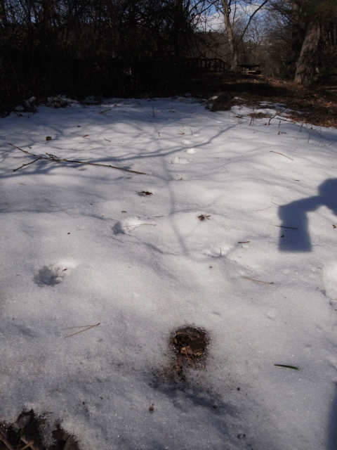いま、冬型の気圧配置が続いていて寒~い仙台です。雪も少し降ったりしています。街中ではほとんど溶けてしまっていますが、山のほうならまだ少し残っているのでは?ということで行ってみました。三居沢から入ってすぐのところにある「展望広場」です。「展望」とはいってもそれほど視界が開けているわけではないですが、雪が積もると少し楽しめます。岩についたコケと、日に照らされてみるみるうちに溶けていく雪すっかり葉の落ちた木(何という名前かは不明)にやってきて実を食べている鳥なんかを撮ったりしましたが、今日の一枚は「雪に残されたあしあと」です。前足のあとをたどるように後ろ足を置いているように見えます。これはタヌキかキツネではないかと思ったり。すくなくともウサギではないですね。右側に、カメラを持つ私の手が写ってます。やる気のない撮り方がばれてしまいますね。明日(日曜日)は今日よりさらに冬型が強まって、仙台でも雪が降るかもしれないとのこと。