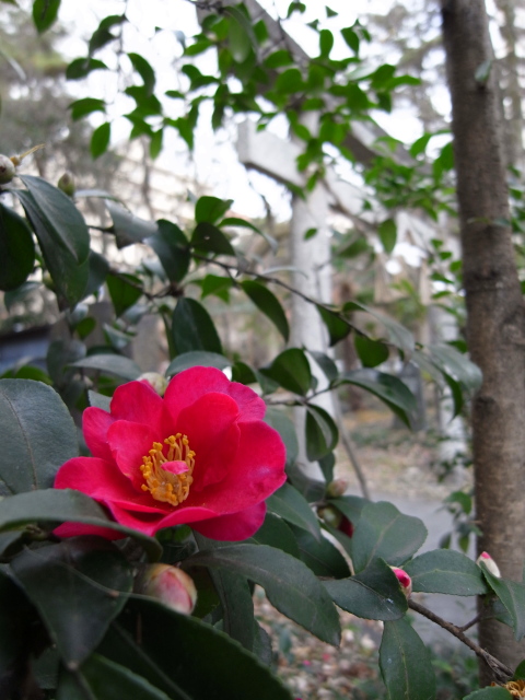 今朝は車で出勤したので、朝の広瀬川はノーチェックです。お昼、仙台市片平にある馬上蛎崎(うばがみかきざき)神社へ行きました。この神社はとても小さいですが、春の小さな野草やアジサイ、そしてこの冬の時期にはサザンカが咲きます。この日記でも今年の1月19日付記事でサザンカの花を紹介しました。このときは、OLYMPUS E-420ボディに古いアダプトール2のTAMRON SP 28-105mm F2.8ズームレンズをつけて撮っていました。別のブログでも紹介してきました。shinodak-photostock 2011/0/04付記事Shino-G備忘録 2011/01/19付記事(こちらの記事は、この日記の記事と同じ写真を掲載していますね)隣には、いつもよく訪ねる良覺院丁公園と緑水庵(2011/11/29, 2011/11/04, 2011/07/04)があります。このときは、E-420とOLYMPUS OM ZUIKO 50mm F1.8レンズのセットも持っていましたが、今日の一枚ではRICOH GXRで撮ったワイド写真をチョイス。神社の鳥居をバックに、サザンカの花です。まだまだ花は楽しめます。良覺院丁公園のヤツデとともに、しばらくフィールドになりそうです。