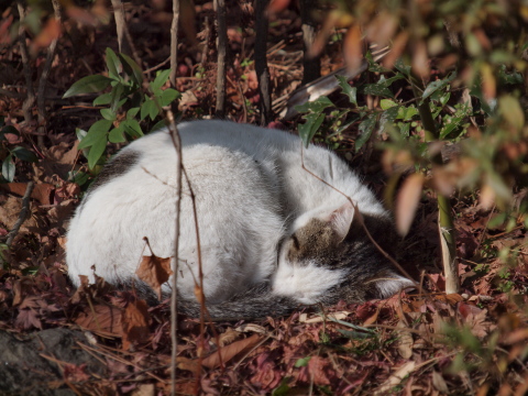ときどき西公園にある桜岡大神宮に出向きます。最近の目的は・・・ネコさんたちです。花などの撮影対象がほとんどない(ヤツデやサザンカはまだまだこれからですが)冬のこの時期、街中では数少ない貴重なモチーフです。昨日、仙台ではおそらく今シーズン初めての本格的な雪になり、ここ数日気温も冬らしくなってきました。広瀬川ではハクチョウはじめカモなどたくさんの冬鳥も集まってきています。今日の一枚は、神社境内のなかでは特等席の、日当たり抜群!おひるねスペースで寝ていたネコさんです。先日ここを訪れたときは、朝は3℃ほど、そして日中は10℃前後まで気温が上がってぽかぽかしていましたが、今日は最高気温が5℃と身体で感じられるほど数日前までとは違う冬の寒さが応える一日でした。それでも、日なたでは目を開けていられないほどの眠気を誘う心地よさなのでしょう。かなり接近しても動じない(動けない?)ので、撮影はとても楽ちんでした。それに油断したからか、あとでピント位置を確認したら・・・接近したために被写界深度が浅くなってしまったというのもあるのでしょうが、雑なピント合わせだったようで「ここぞ!」という場所から微妙に外れた残念な写真ばかり・・・(;_;)OLYMPUS ZUIKO DIGITAL ED 50-200mm F2.8-3.5 SWDレンズは、超音波モーターのおかげでピント合わせが素速くて、テンポ良く撮影できるのはよいのですが、一枚一枚への思い入れが弱くなってしまうのかもしれません。気をつけなければ。