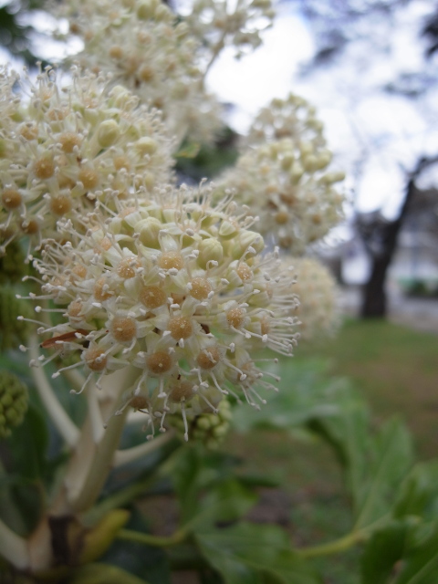 東北大学の川内南キャンパスから、全国的に有名な青葉城隅櫓を抜けて大橋、西公園へと抜ける途中、隅櫓前の信号横には支倉常長の銅像があります。その背後には池と花木があって、ちょっとした庭園のようになっています。池の水は抜かれている(のか、漏れていて溜めることができないのか)ので若干風情がない感じですが、ちょうど大きなヤツデの花が咲いていて、車で通りすぎるときも一瞬、目に止まるほど見事です。そこで、RICOH GXRを持ってこの大ヤツデの花に迫ってみることにしました。やはりAFしかないこのカメラでピントをうまく合わせるのは難しいです。シャッター半押しで適当な距離のものにピントを合わせ、その状態をキープして前後に動かし、目的の被写体にピントを移す・・・というふうにすればなんとかなりそうです。しかし、光学ファインダーを覗いての撮影と違って、コンパクトデジカメのようにすこし離れた視点から液晶を見ながらのピント合わせは、思いの外「ハズレ」が多いです。もしかしたら、光学ファインダーとはいきませんが電子ビューファインダーが必要になってくるかもしれません。さて、今日の写真では右後方に辛うじて隅櫓の姿が写っています。なんとか、このヤツデの花が特別な場所にいることを示す写真がギリギリ撮れました。天気が良ければ、花にたくさんの虫が集まってくるのでしょうが・・・今日の仙台は朝から肌寒く、早朝は晴れ間も見えていたものの日中はずっとどんより曇っていました。今日は、ようやく車もスタッドレスタイヤに履き替えて、冬への備えは万全です。