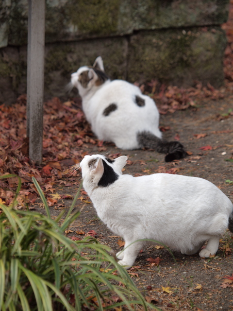 昨日の夜は皆既月食でした。だいぶ欠けて、もうすぐ皆既になりそう!というところで薄い雲がサーッとやってきて、月を隠してしまいました。OLYMPUS E-620にZUIKO DIGITAL ED 50-200mm F2.8-3.5 SWDレンズをつけてスタンバっていたのですが・・・残念。今朝の仙台は天気も良く、気温は3℃ほどでしたが寒くはありませんでした。広瀬川へ行って、ハクチョウやカモたちを1時間ほど追いかけて、朝ご飯のあとに大崎八幡神社と西公園の桜岡大神宮をはしごしました。桜岡大神宮にはネコさんたちがいるので、とても楽しみにして行きました。日なたで「ぼてーっ」と寝そべっているネコさんといそがしく歩き回るネコさん。そして、さささーっと本殿の石垣に駆け寄っていき、座ったかと思うとじっと上を見上げているネコさん。あとからもう一匹来て、二人で上を見上げます。ポツポツと天気雨が落ちてきていたので、それを気にしていたのでしょうか?この二人、たぶん兄弟だと思います。夏にはもっとたくさんなかまがいたように思うのですが、ほかのネコさんは最近見かけません。大きくなって、自分のなわばりを探してどこかへ移っていったのかもしれません。