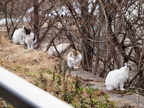 ここのところの厳しい寒さは和らいで、風もおだやかな一日でした。ここ最近お気に入りの撮影スポット、仙台市西公園へネコさんたちを撮りに出向きました。今日はあいにく曇っていて、ぽかぽか日なたぼっこは望めないなあ・・・などと思いながら現場へ。いつもは、西公園の中にある神社、桜岡大神宮の境内を少し探せば必ず寝転んでいるネコがいるのですが、この日はさすがになかなか見当たりません。神社の境内を出て、公園のほうへ向かうと・・・いつも神社で見かけるネコのほかにもたくさん!よく見ると、模様がよく似たきょうだいのようなネコたち。模様が違っていても、なんとなくみんな顔つきが似ているような気が。草むらの中を動き回っていたので、からだにたくさん「ひっつきむし」をつけていました。そのネコさんたちを追いかけ回していたわたしのズボンにも・・・!あとで気づいてびっくり。ここではOLYMPUS E-620にOLYMPUS ED 50-200mm F2.8-3.5 SWD望遠ズームレンズをつけて撮影しましたが、ピントが合ってからシャッターボタンを押し、シャッターが実際に切れるまでのタイムラグが若干長いのか、歩いている(特にこっちへ向かってくる)ネコさんはほとんどピンぼけになってしまいました。このレンズ、超音波モーターのおかげでピント合わせが本当に速いんですが、それだけではいかんともしがたい問題はカメラボディ側にありました。いつもはじっと寝ているネコさんしか撮っていなかったので表沙汰になっていなかったんですね。やはり、フラッグシップ一眼レフのE-5か、コンパクトマイクロフォーサーズの最高峰E-P3またはE-PL3を導入しなければならないのでしょうか・・・