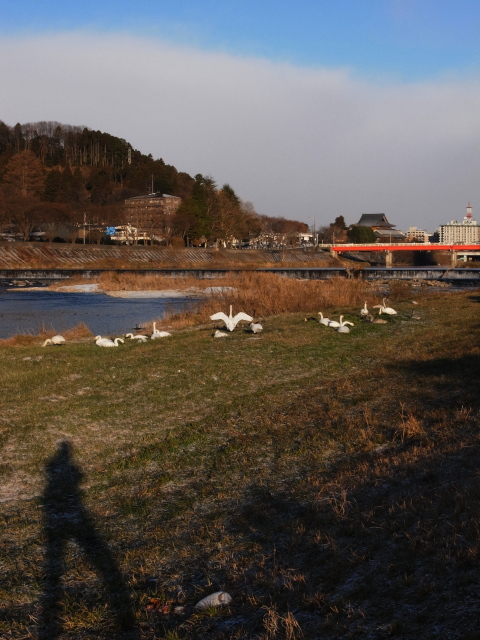 今朝の仙台は氷点下。家を出るときはマイナス1℃でした。広瀬川ではハクチョウたちが集まっていましたが、今朝はほぼ全員が陸に上がってお食事していました。数えてみると(川で泳いでいたものも含めて)やはり25羽。先日から変わってません。このまま人口増加はなく、この25羽で冬を越すのでしょうか?RICOH GXRのS10レンズユニットでは、望遠にしても最大72mm相当。本来なら中望遠なのでしょうが、普段フォーサーズの一眼レフカメラで扱っているのが100mm相当以上なので広角のような感覚です。ちょうどこちらからは朝日を背にしてカメラを向けるかたちとなるので、私の姿もフレームに入ってしまいます。