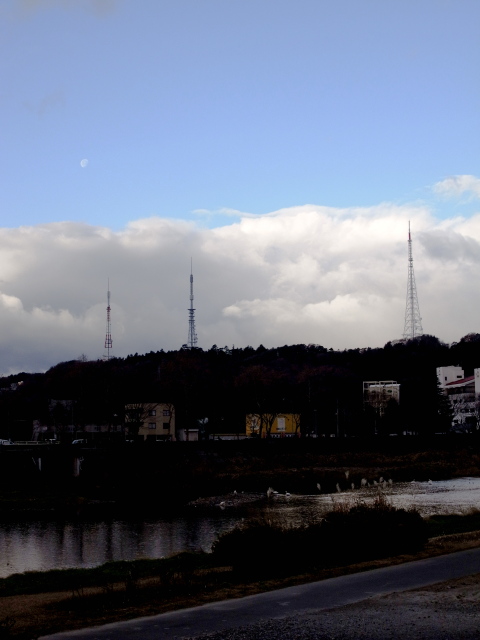 今朝の仙台は、出かける時間帯の気温が6℃ほど。昨日までの朝の気温と比べるとかなり暖かい印象でした。が、今日一日どんどん気温が下がっていくという朝の天気予報にビビりながらの出勤です。先日10日の満月の夜には、かなり好条件の皆既月食があったのですが皆既直前になって雲に隠され、見ることも写真におさめることもできなかった、あの月が西の空に。そして広瀬川を挟んで木流堀(きながしぼり)の出口にある小さな中洲にはハクチョウさんたちが集まっていました。大年寺山と仙台放送の鉄塔がバックに入り、なかなかの構図だなあ、とシャッターを押した一枚です。ここ最近の朝のお供、RICOH GXRでの撮影ですが、S10(28-72mm相当ズームレンズ)の35mm相当で撮ったこの写真、月がきれいに写っています。(ここではリサイズしているのでディテールがわからなくなっていますが)月を主役にするために、明るい空を飛ばさない露出設定としたところ、相対的に暗い広瀬川の様子が黒くつぶれてしまいました。ハクチョウさんたちは白く輝いていましたので辛うじて姿がわかるのですが、木流堀出口の様子はこの写真ではわかりませんね。コントラストを下げて全体が階調の中に収まるようにすれば、月が空に溶けて見えなくなってしまうでしょう。こういうモチーフは難しいです。