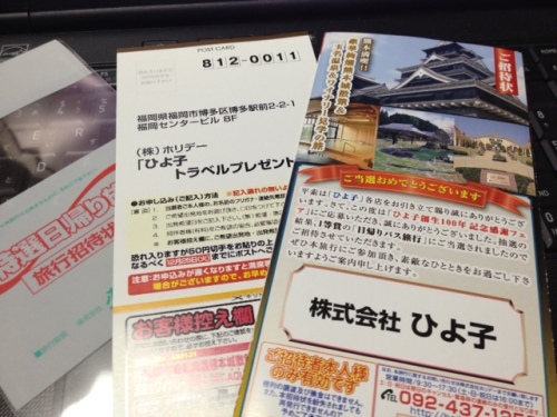 寒いですね~~。けふはお休みで食材の買出しやら、バイクのオイル交換などででぃーぜる君 にほぼ乗りっぱたしだったのですがもう寒くて冷たくて、足が冷えすぎて痛くなり霜焼になりそうでした。もちろん、ユニクロのウルトラダウンの上に防寒モッズコートデニムデギンスの下には、ヒートテックのレギンスという重装備。にもかかわらず、とにかく寒かったです。こんなに冷え込んだのは久しぶりですね。 さてさて。昨日、郵便物が届いていた郵便物を今朝チェックしていると銘菓ひよ子 の ひよ子本舗吉野堂 からなんと!!日帰りバス旅行の当選のお知らせが来ていました!!! こんなん出してたっけ??応募ハガキとか出した覚えがなかったのでなんでかなと思っていたら 先月 うずみみさん のお誕生祝いに季節限定栗餡のひよ子 を贈った際に応募用紙を店頭で書いたことを思い出しました。ペアチケットではないので、同伴参加は有料¥6800。気軽に誘える額ではないので、ん~、ちと残念。 内容は玉名温泉と熊本城・天守閣見学。食事は熊本県菊水でせいろ蒸し御前付。ひとりで行けるもん!! ありがとうよ!! ひよ子!! にほんブログ村当りついでに宝くじ買っちゃったもんね!!