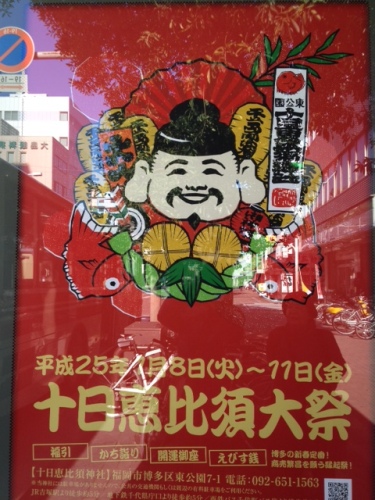 ばあちゃん(MY母) の通う 病院の通り道に十日恵比寿神社 があり毎年 1/8-1/11 の間は 十日恵比寿 で盛り上がります。 せっかく期間中に前を通るのだからもちろん、ばあちゃん(MY母) と、寄って参拝してきました。西鉄バスの各パス停に飾られた大きなポスター。 祭好きの ちかりーぬ は、ここ数年は毎年十日恵比寿祭に合わせて休みをとって、参っているのですが今年はシフトの調整が入り今日しかお休みがとれませんでした。一日だけしか行けないのは悔しいので夕べ、仕事が終わって(21時過ぎ)行ってみたらものすごい行列。参道どころか、参道前の出店が並ぶ道路の出口をはみ出て参拝客が並んでいます。最後尾だと、この出店すら見えない場所になります。 参拝は諦めて、とりあえず本殿の様子を見に出店の横を通り抜けて前へ進みどうにか鳥居をくぐるとこまでは行き着いたのですが参拝の行列と、参拝を終えてもどる人たち福みくじに並ぶ人たちなどもう鳴門の渦に巻き込まれたような感じになりにっちもさっちもいかず・・。やっとのこと、参拝から戻る人たちの流れに乗ることができ外に出ることができました。久しぶりに不安で泣きそうになりました。 さてさて、十日恵比寿も最終日。人出は多いものの、楽勝で本殿までいけました。 先日の仕事始めでもですが他県では、会社総出での参拝って珍しいのかな?福岡ではわりと当たり前です。十日恵比寿の時も、平日昼間会社員が連れ立ってお参りにくるのは普通です。最終日の今日も、社員が参拝を終え福みくじをひく姿を沢山見かけました。 手水の真ん中は 口から水を出す鯛。 恵比寿様の大物一本釣り!!ふくふく~~~大当たり~~~恵比寿せっと~~~~ おみくじ は 吉。 ちょうど、自分が思っていたことが書かれていたのでちょっとびっくりしました。 ばあちゃん(MY母) は 大吉 をひいてご満悦。この後、中洲で焼肉を食べて帰りました。 にほんブログ村今日は 日本晴 でした。晴れてると、心も体も軽くなるなあ。