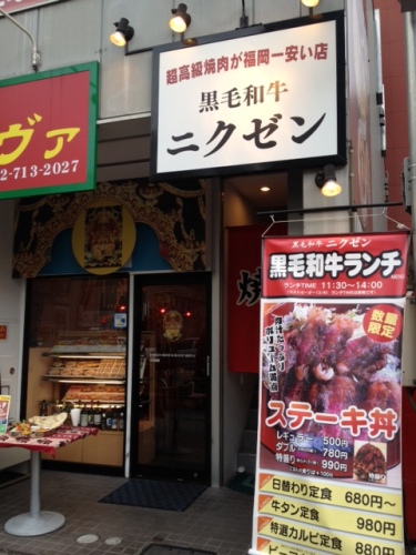 昨日はお休みで朝一で加圧トレーニング 昼はメインの会社の同僚とランチ夜は BALLちゃん と晩御飯とゆう出ずっぱりの一日でした。 さてさて。以前ご紹介した 志免町 の ハチミツボタン を教えてくれた Nさん オススメ第2弾。黒毛和牛 ニクゼン へ行ってきました。厳選黒毛和牛を格安で食べれる店 ニクゼン - 赤坂/焼肉 [食べログ] 和牛のステーキ丼(並)が¥500-!!ここは何度もテレビで紹介されたりして、周りの人もよく知っているお店。しかも量が多く、美味しいと評判。 同僚はAランチ(和牛切り落としステーキ)。¥680-。私はステーキ丼のダブル。¥780-。焼きは超レアで私好み。脂身部分もさっぱりとしていて、脂っこいものだと「 オエっ 」 ってなる私でもぜんぜん大丈夫でした。 ランチ時なので、長居は無用。満腹たぬき腹をかかえて、腹ごなしに天神散歩。天神赤坂一等地にある、古びた市場。赤坂門市場。 狭くて小さい市場のほとんどのお店は既に閉店しています。きっと20年も前だったら、もっと賑わっていたんだろうな。こうゆう市場や商店街が廃れていくのは本当に寂しい。 その中で灯りがともり、営業している ヤング美容室。ナイスなネーミングもさながら緑の淵の出窓や飾り窓が、昭和メルヘンチックでかわいい。 この後、同僚と17時半までお茶。もう職場の愚痴言いまくり。心のデトックス。あっ という間に夕方になりました。 レジで50円のお釣りだったので「 お釣りは10円玉でください。 」 というとレジの男性が 「 1円を50枚ですか?? 」 レジの方の聞き間違いなんだけど、50枚の1円のお釣りを貰った想像をしてしまいその場で爆笑。 同僚と二人、笑いで前かがみになりながら店を出ました。 BALLちゃん との晩御飯は、博多駅の中のデイトスの食堂街の和定食やさん。(名前忘れた)当初考えていたお店は忘年会の予約で満杯。読みが甘かったっす。夕食時で、店の外に並んでいる人もいたので食べたら早々にお店をでて、お茶しながらおしゃべり。BALLちゃん が新しく購入したぎゃらくしーのーと(えるてーいーきしゅ)のすばらしい機能を小出しに披露するのと妬ましい気持で眺めました。でっかくて、i-phoneのシリとは違ってお利口さんでした。 食って飲んで喋っての繰り返しの一日だったなり!!にほんブログ村女子会ってこんなもんだよね。コメント・訪問は明日になりマッスル!!